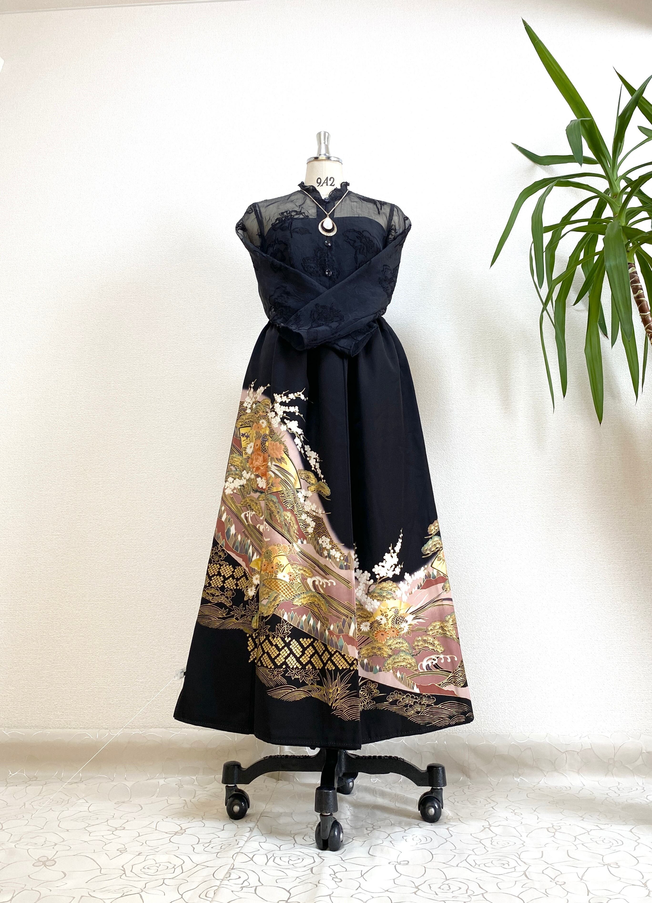 黒留袖着物リメイクウエストゴムロングスカートフリーサイズ