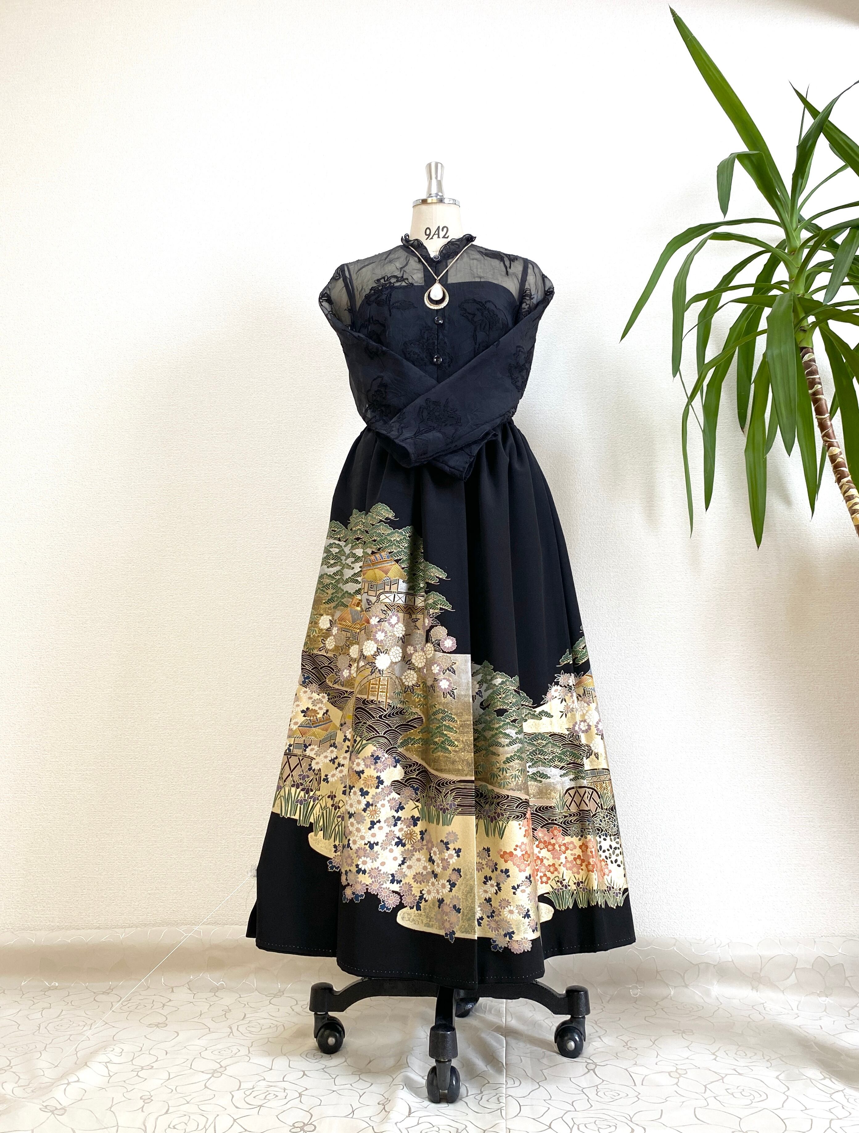 黒留袖着物をリメイクして作製したウエストゴムロングドレススカートフリーサイズです。