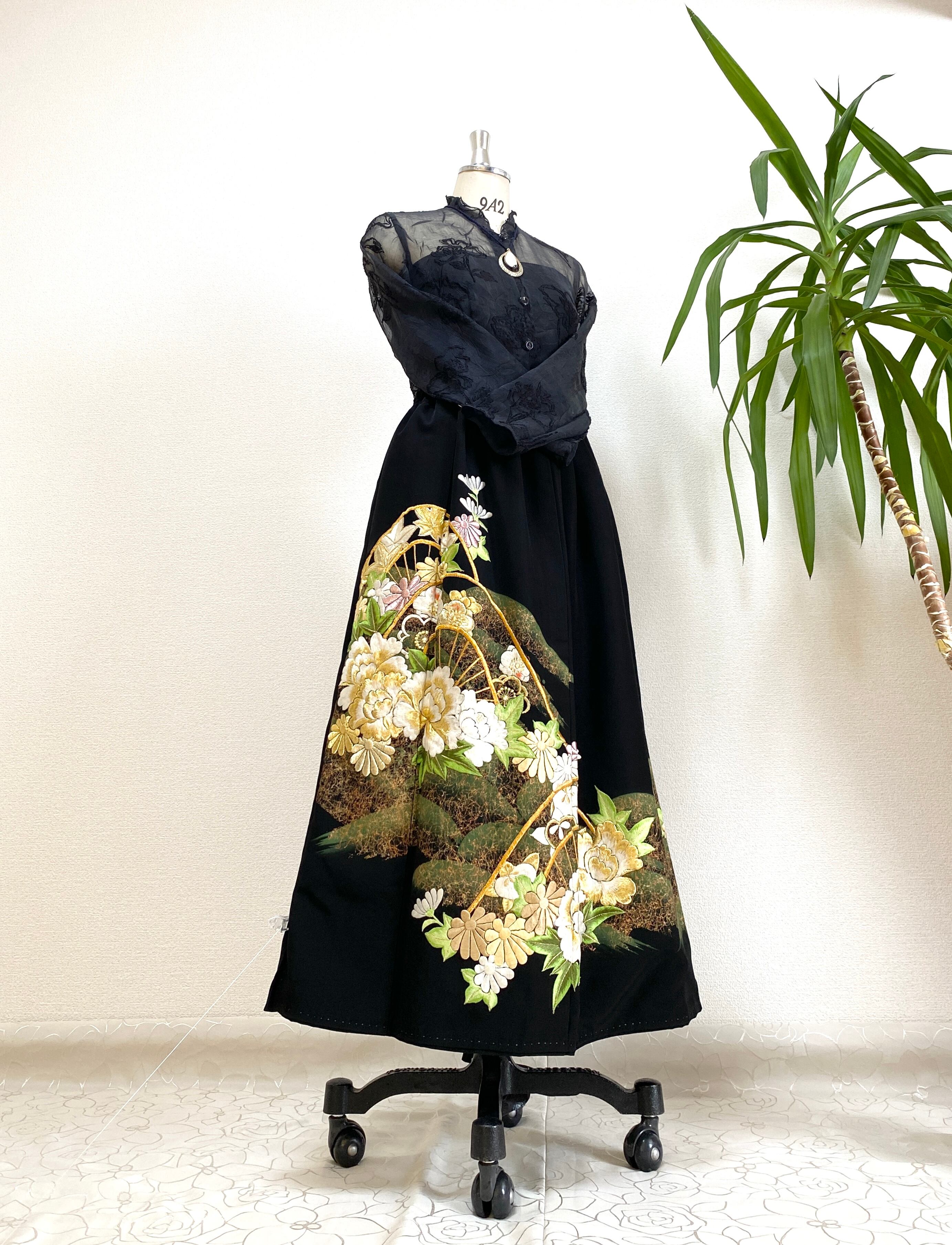 黒留袖着物リメイクウエストゴムロングスカートフリーサイズ