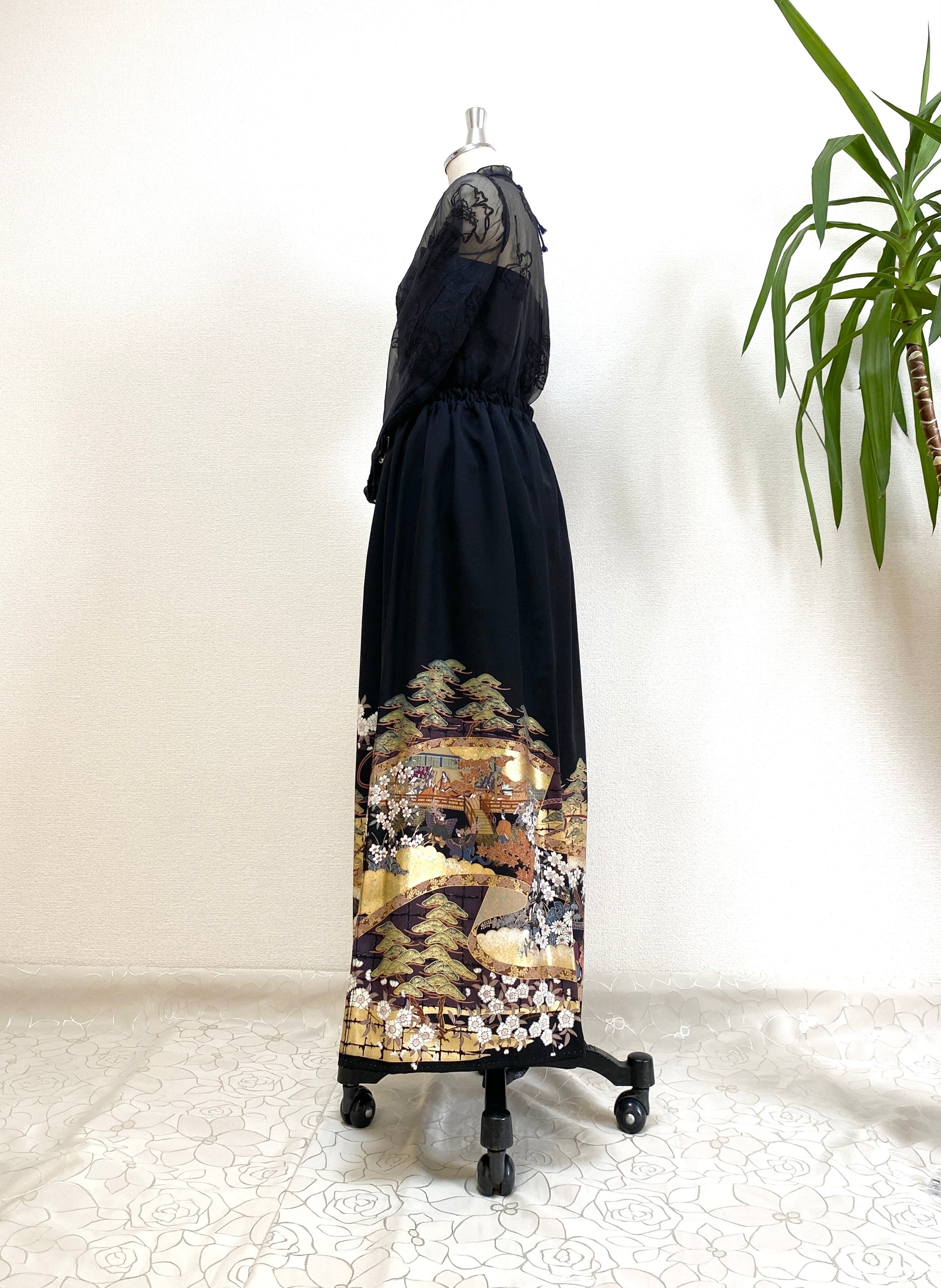 黒留袖着物リメイクウエストゴムロングスカートフリーサイズ