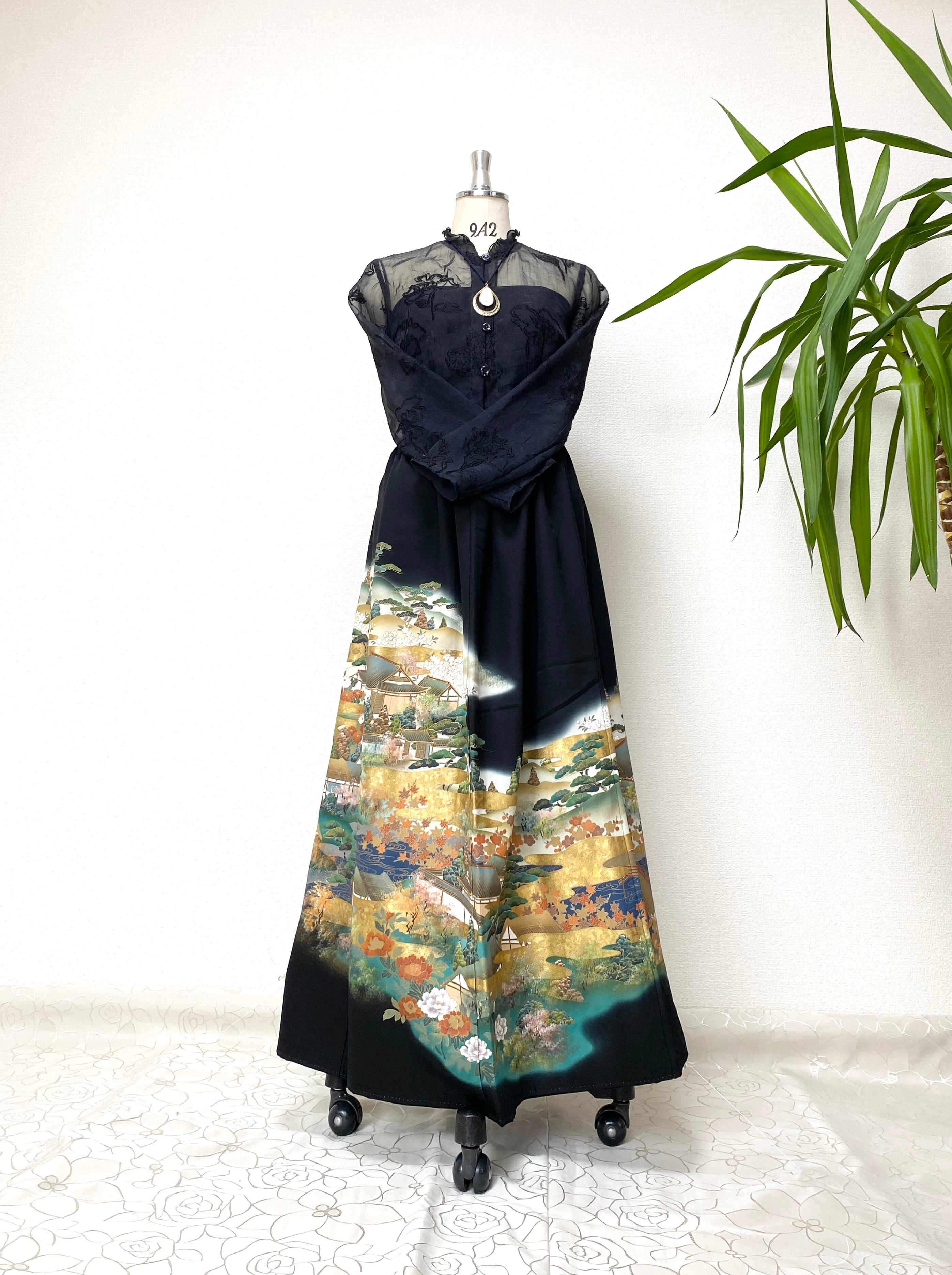 黒留袖着物リメイクウエストゴムロングドレススカートフリーサイズ【超ロング丈】