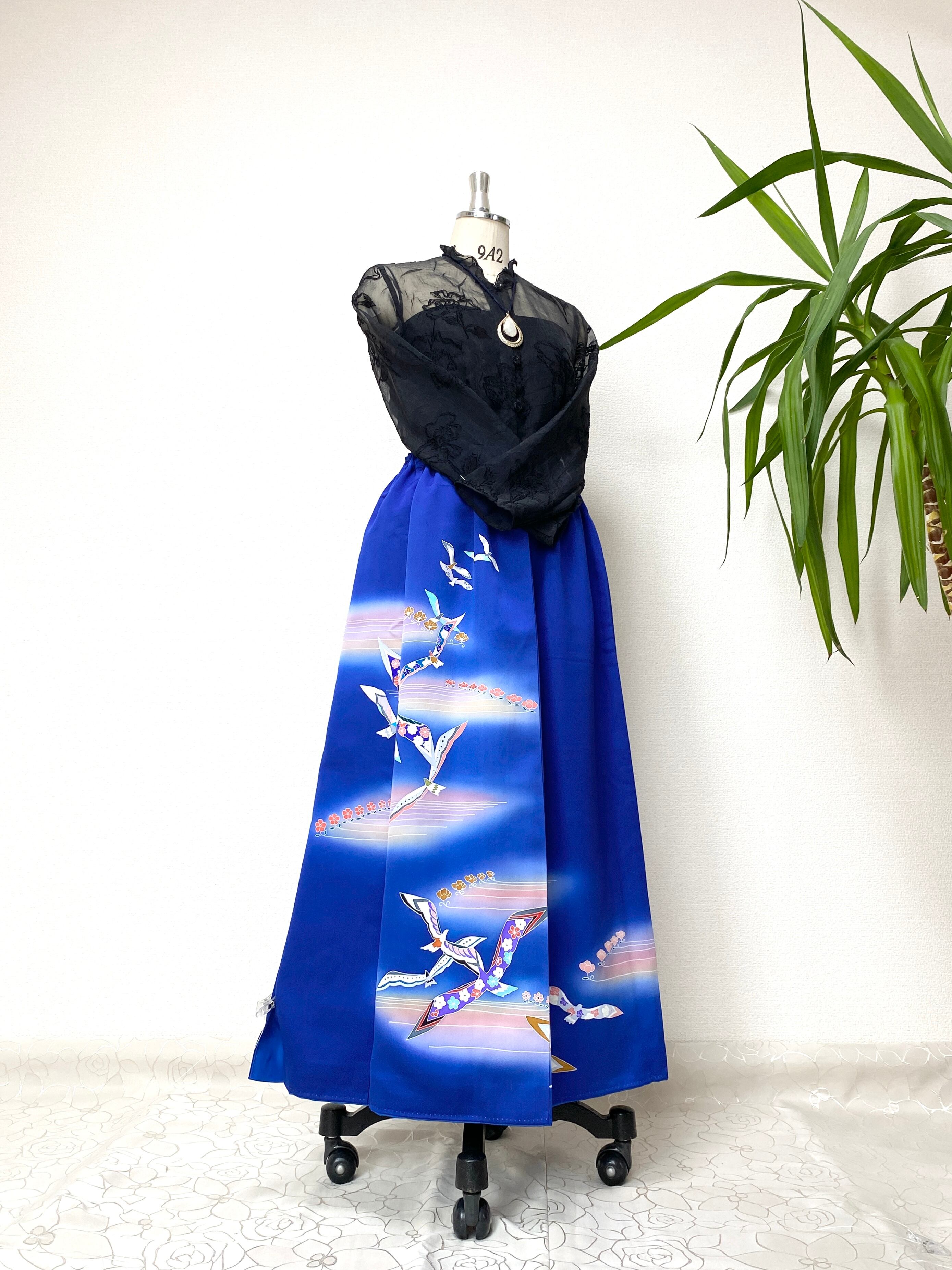 着物をリメイクして作製したウエストゴムロングドレススカートフリーサイズです。