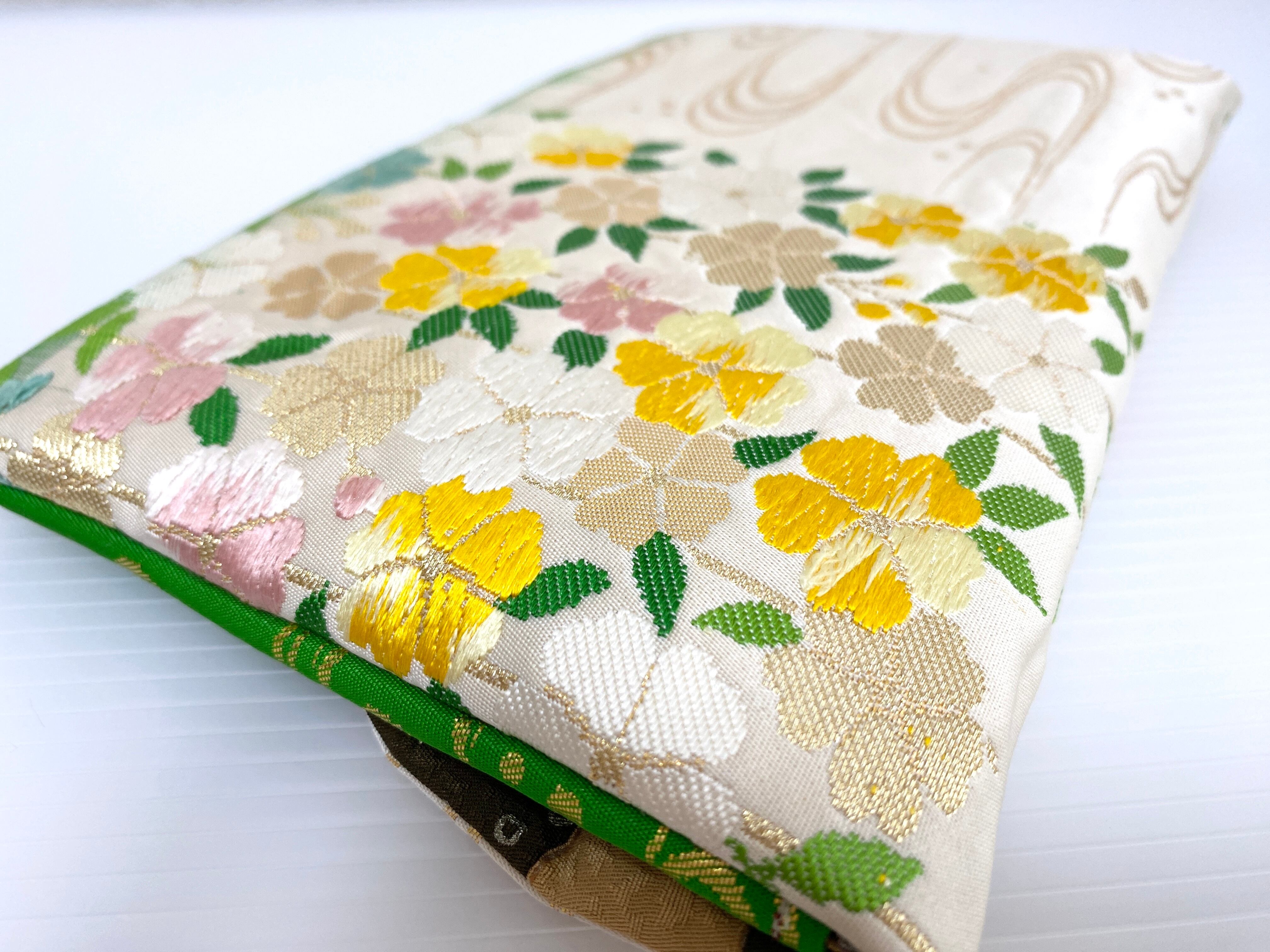 触り心地が滑らかで手にしっくりとくる安心感。絵柄の鮮やかさは日本の着物帯ならではの存在感で素晴らしく華やかな美しさです。