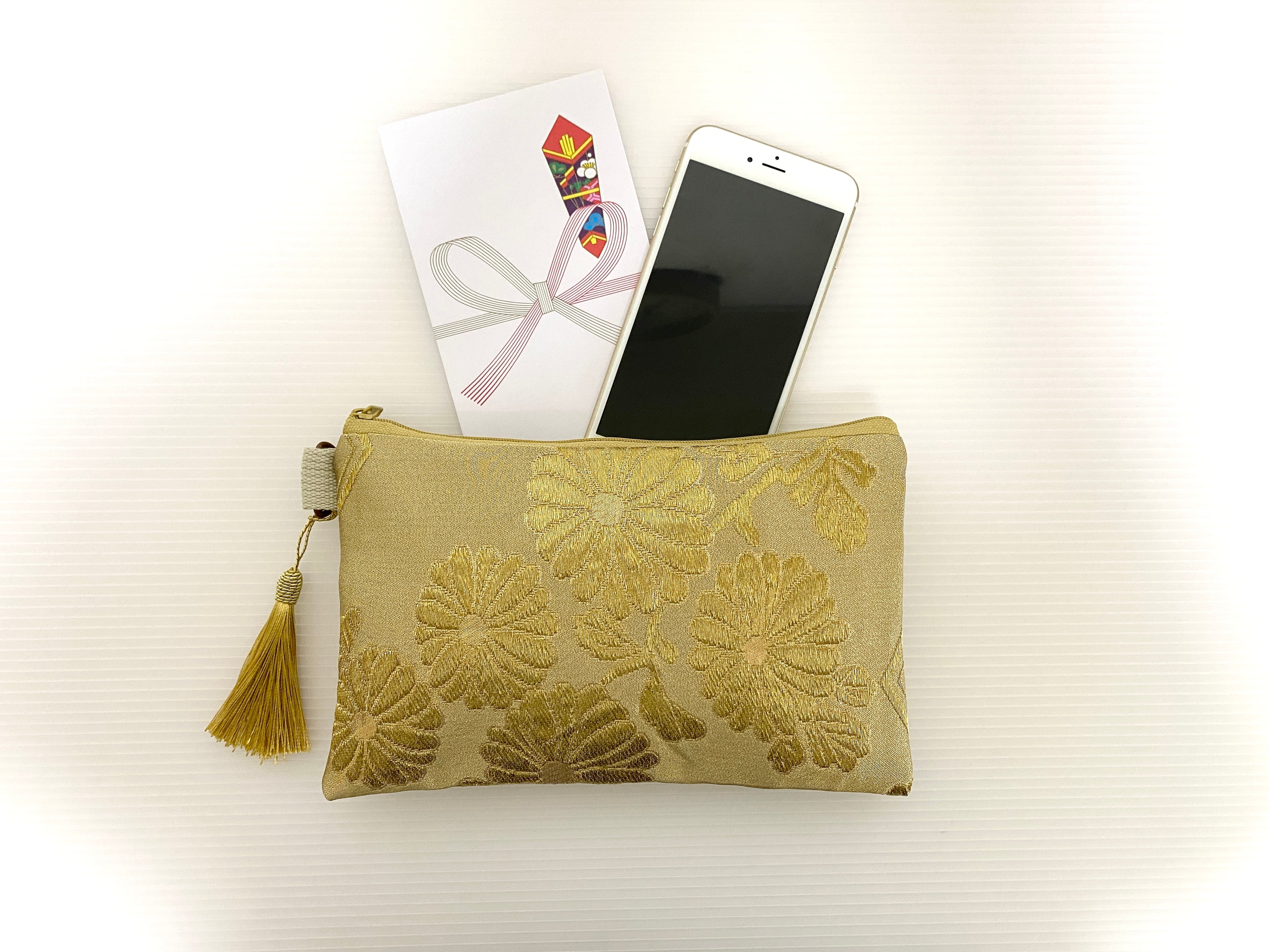 日本の古帯をリメイクして作製したポーチでハンドメイド品です。