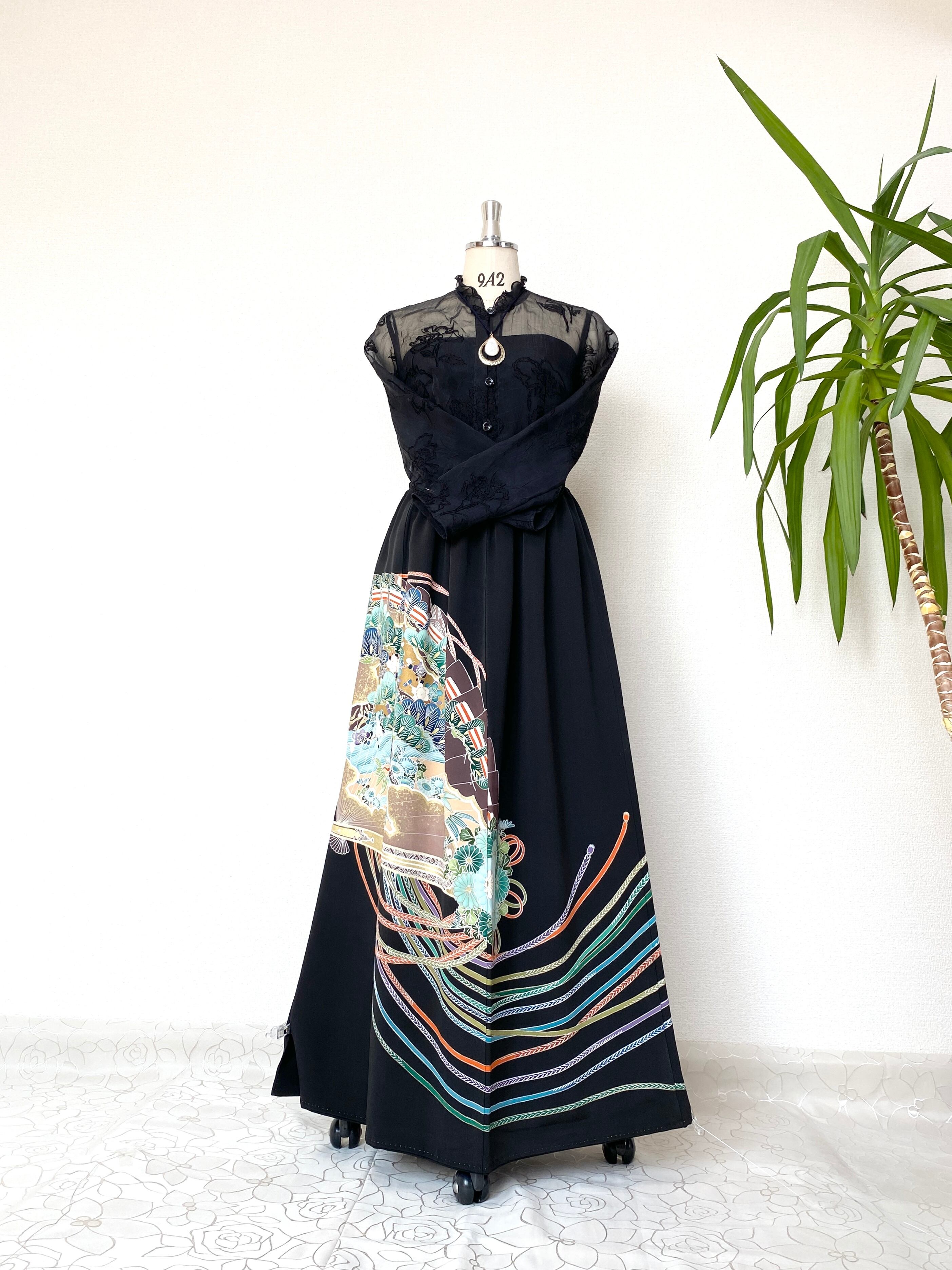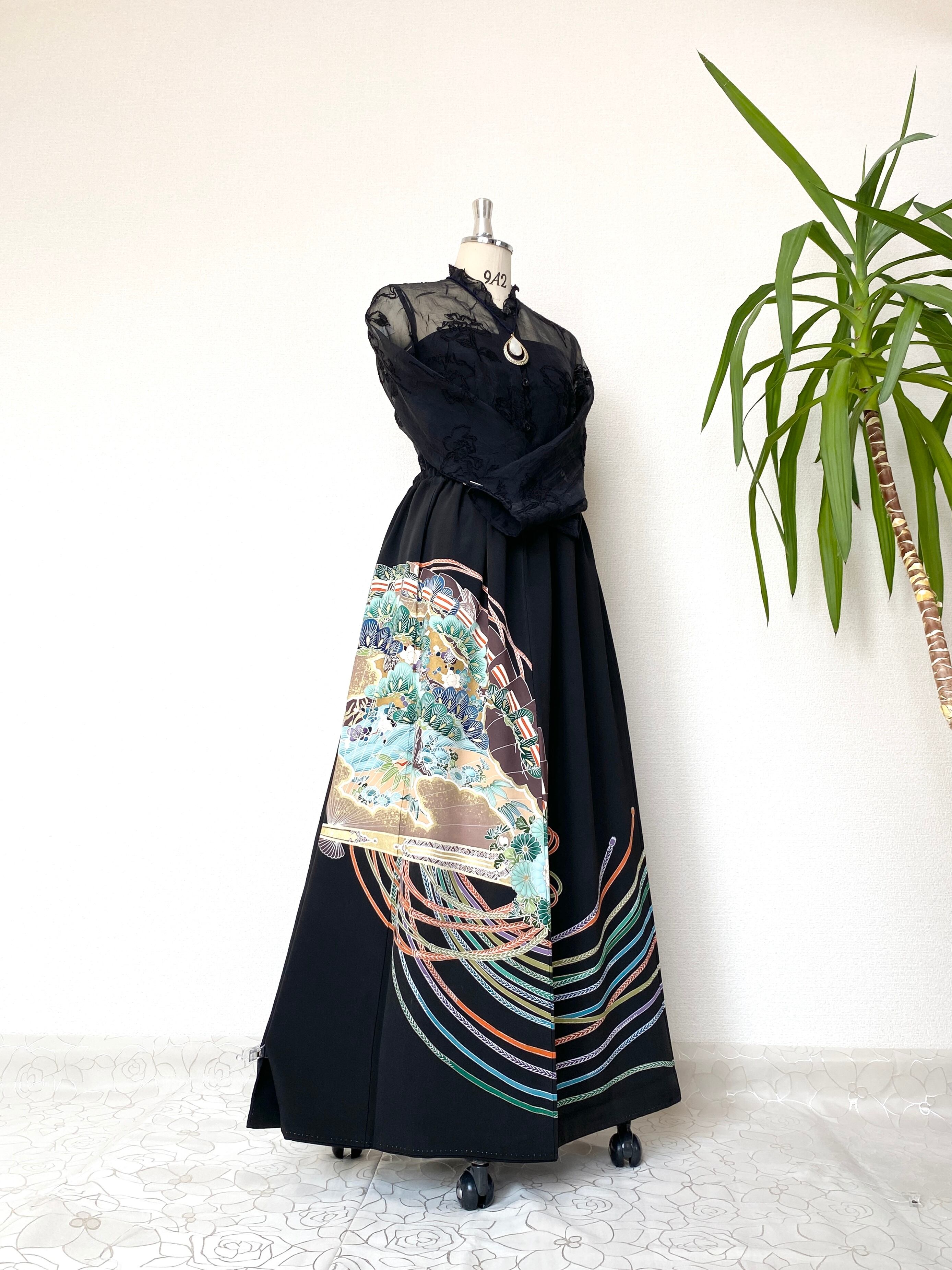 黒留袖着物リメイクウエストゴムロングドレススカートフリーサイズ【超ロング丈】