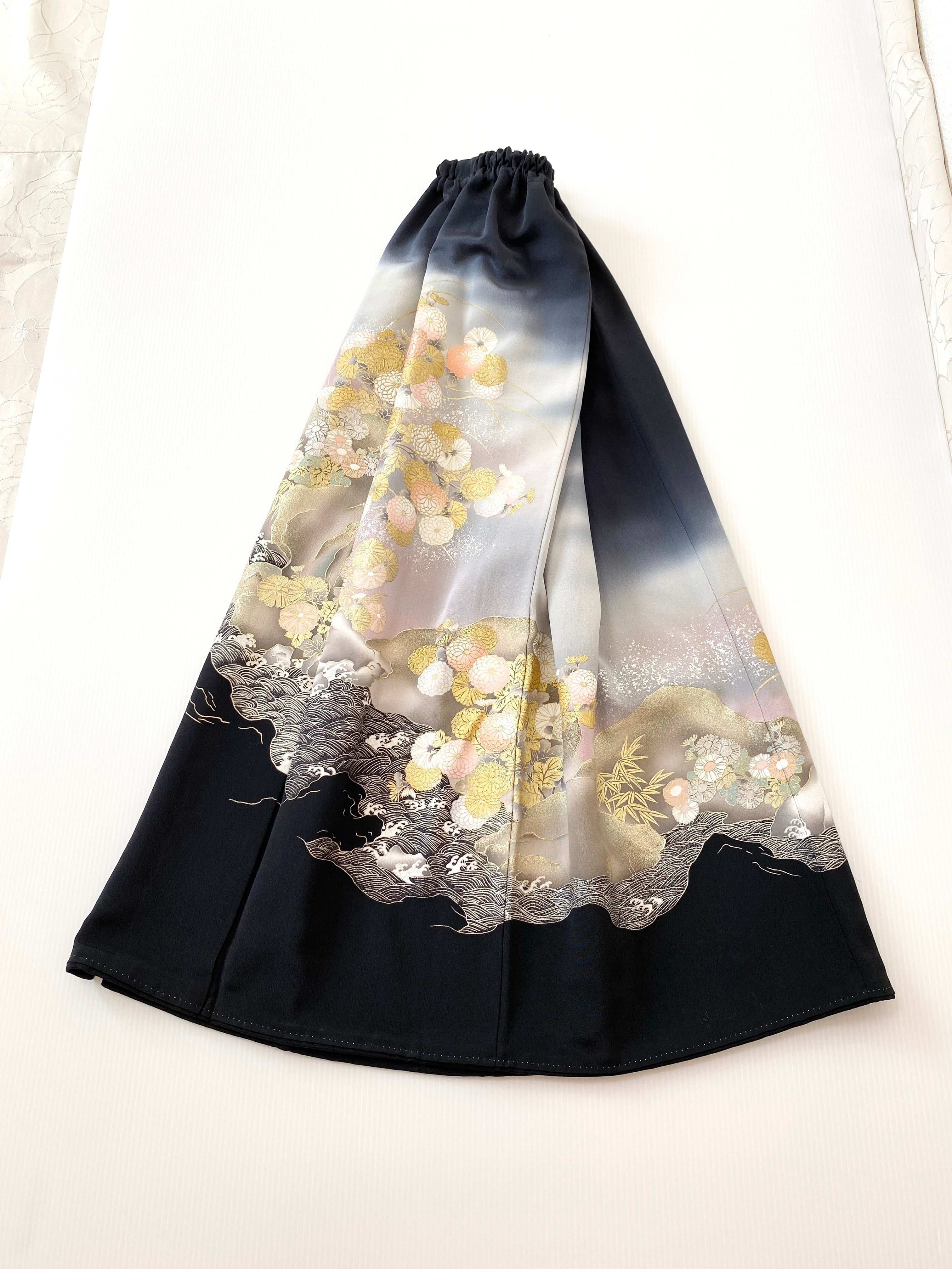 黒留袖着物をリメイクして作製したウエストゴムロングドレススカートフリーサイズ【超ロング丈】です。