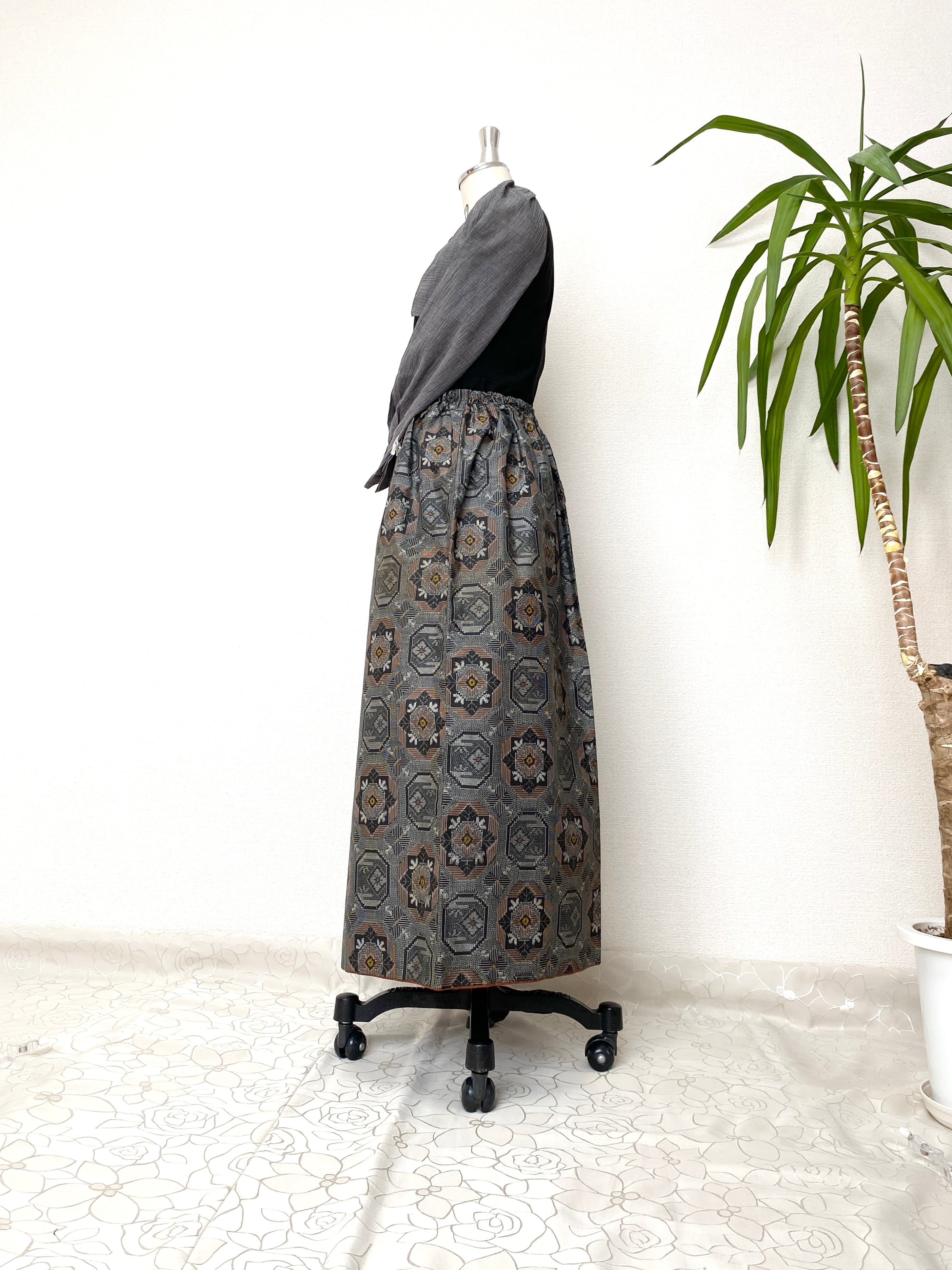 大島の着物をリメイクして作製したウエストゴムロングドレススカートフリーサイズです