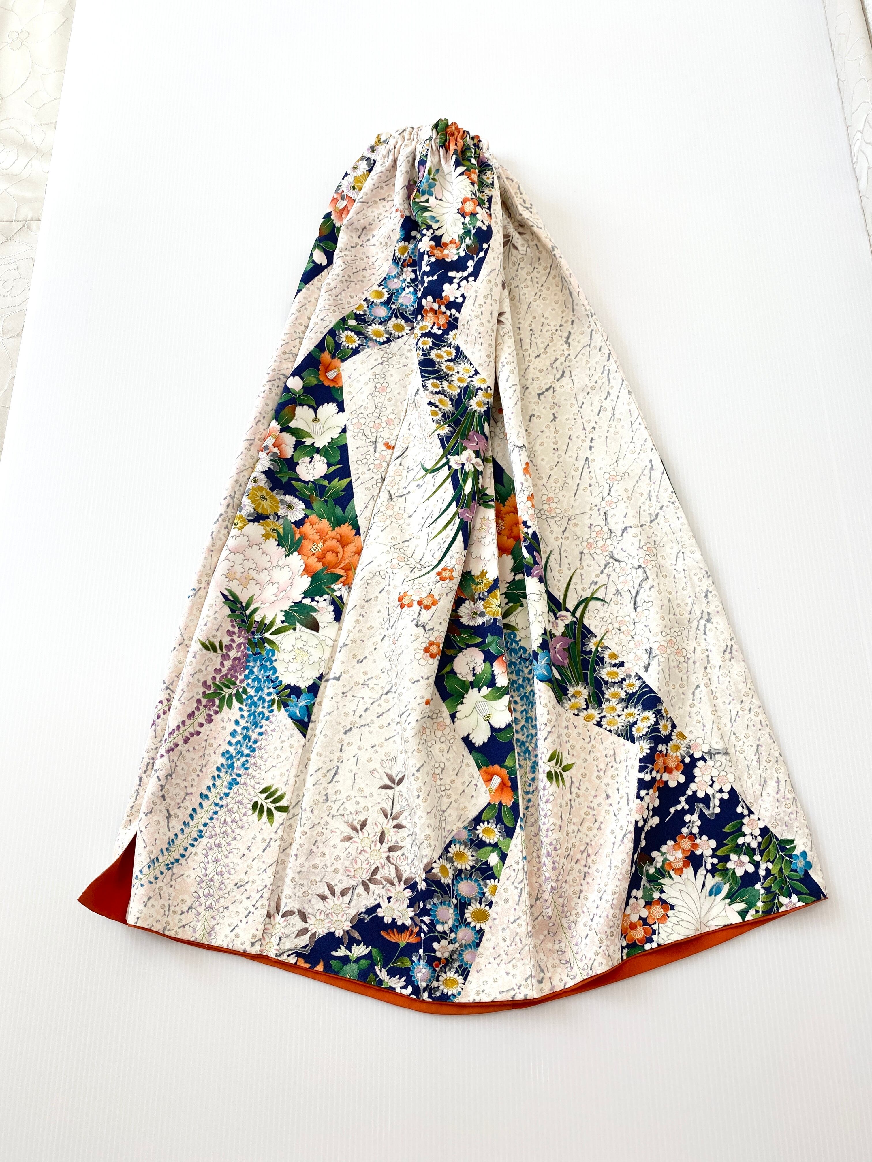 着物をリメイクして作製したウエストゴムロングドレススカートフリーサイズです。