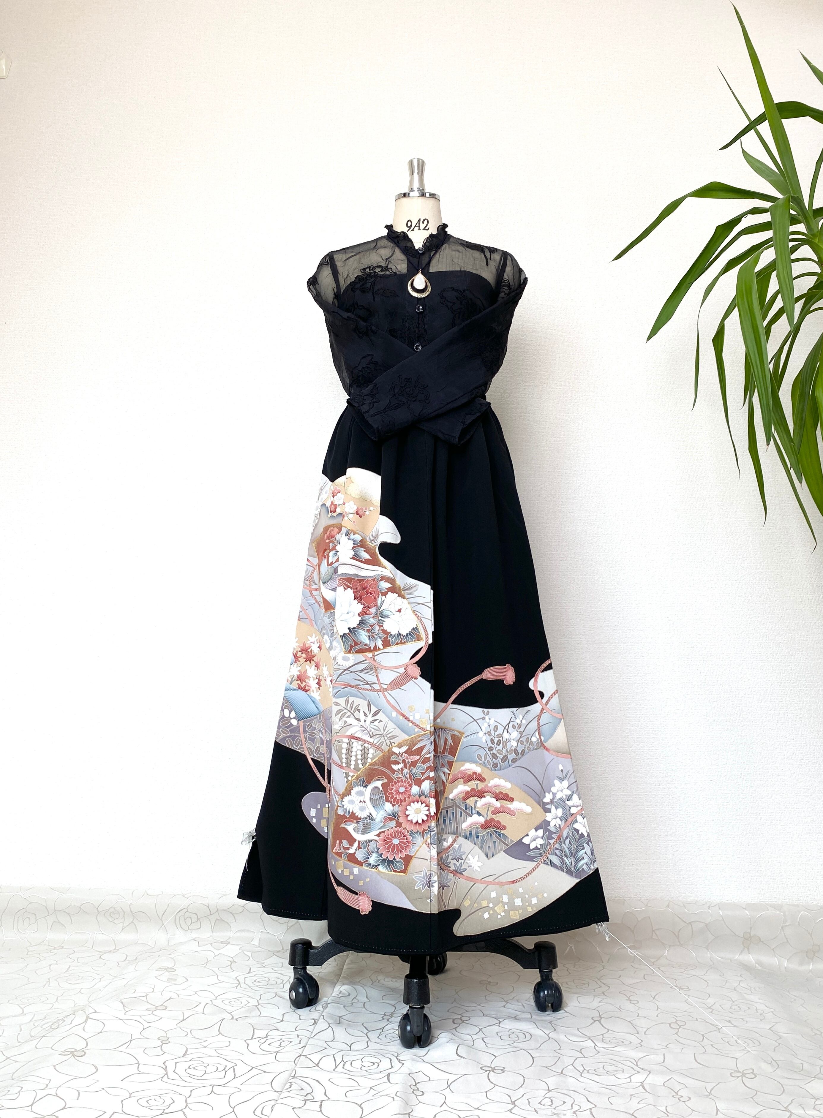 黒留袖着物リメイクウエストゴムロングスカートフリーサイズ