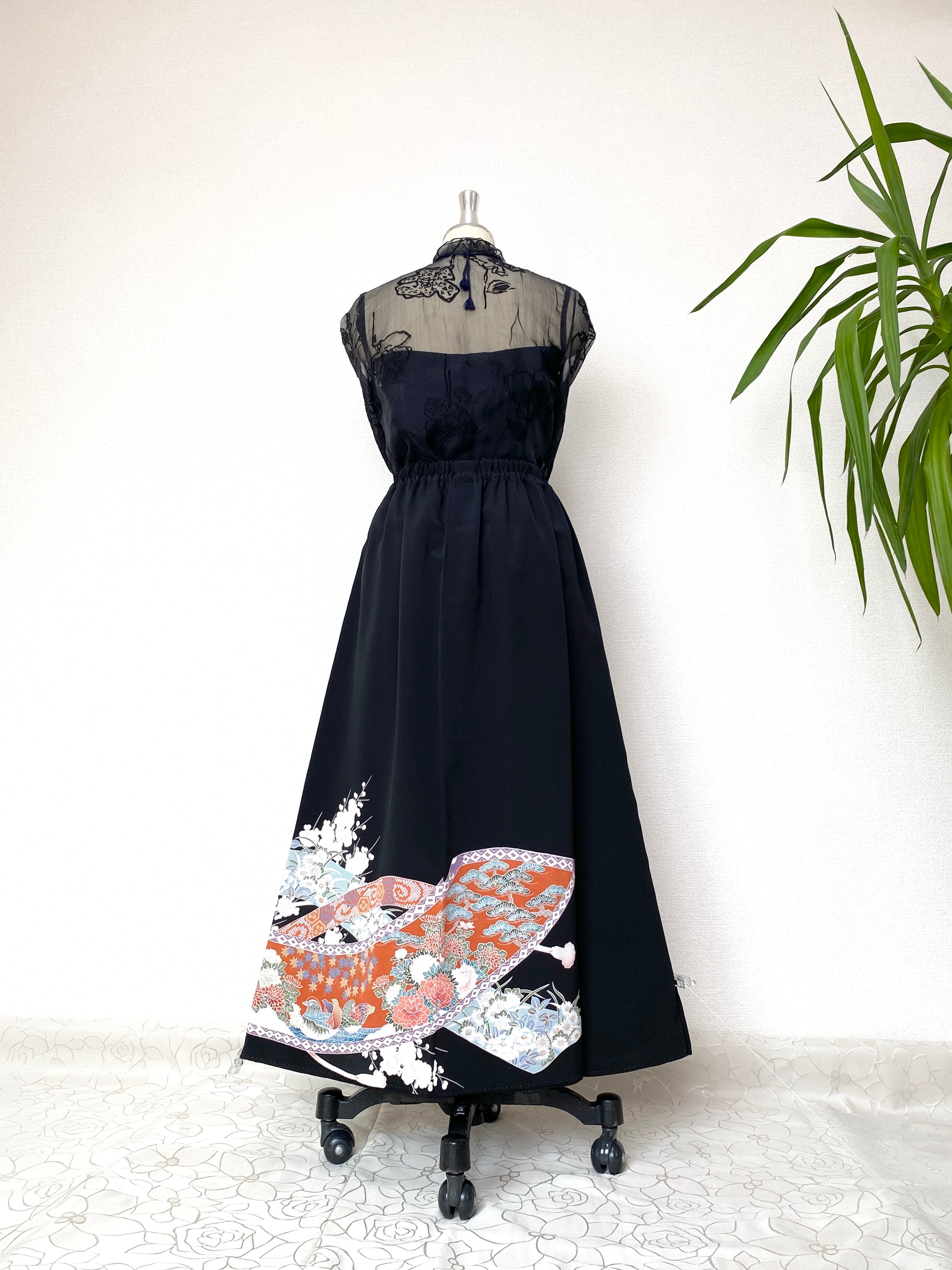 黒留袖着物リメイクウエストゴムロングスカートフリーサイズ
