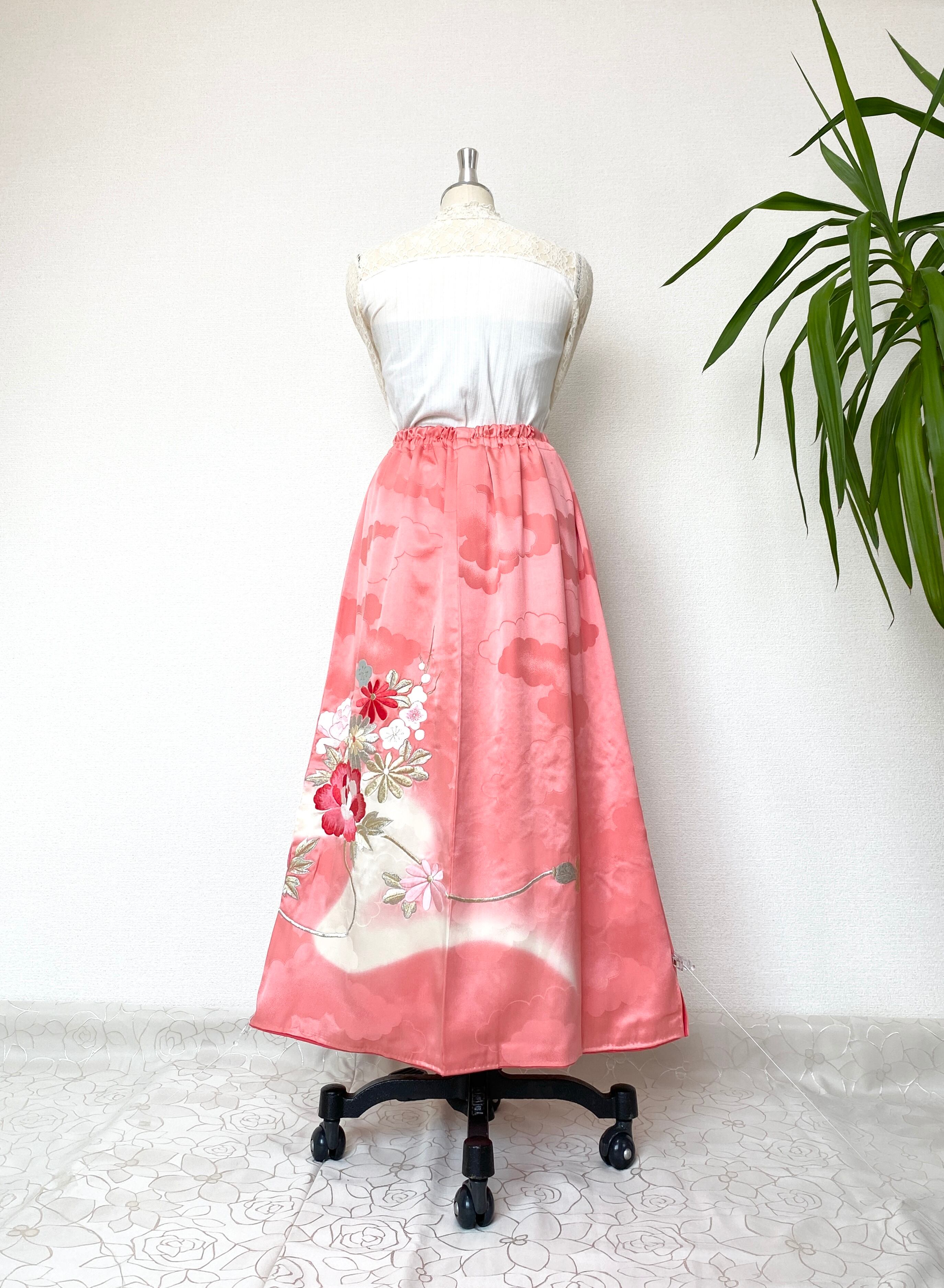 着物をリメイクして作製したウエストゴムロングドレススカートフリーサイズです。