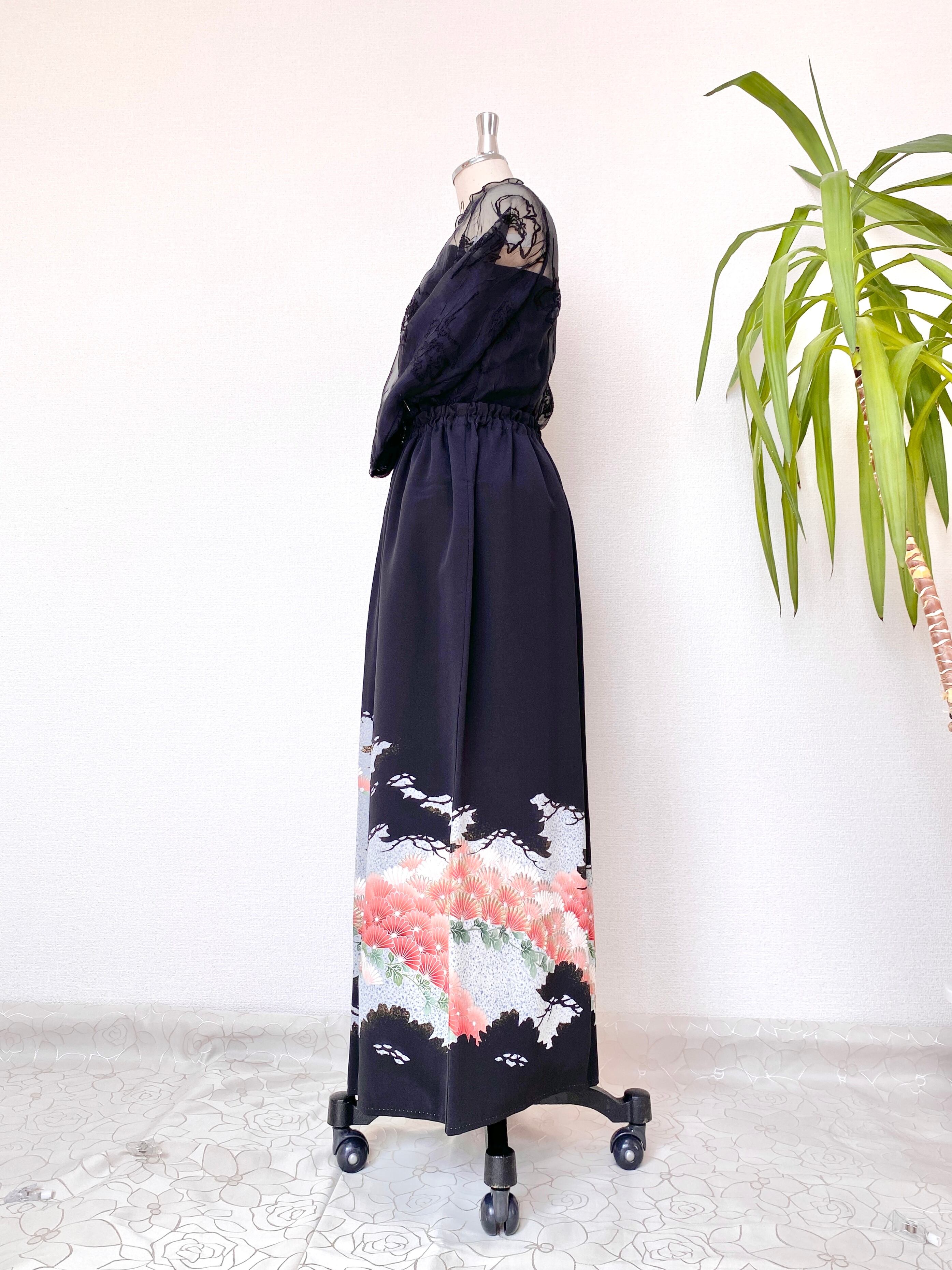 セレブ着物スカートフリーサイズ黒留袖着物リメイクウエストゴムロングスカートフリーサイズ