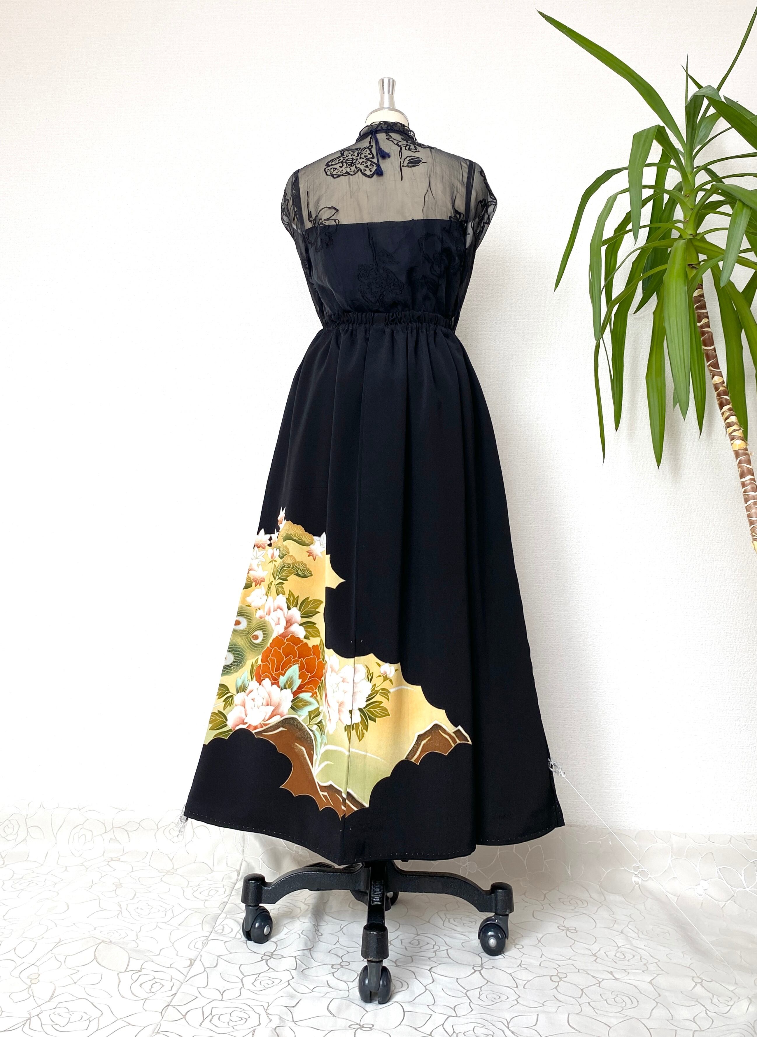 黒留袖着物リメイクウエストゴムロングスカートフリーサイズ