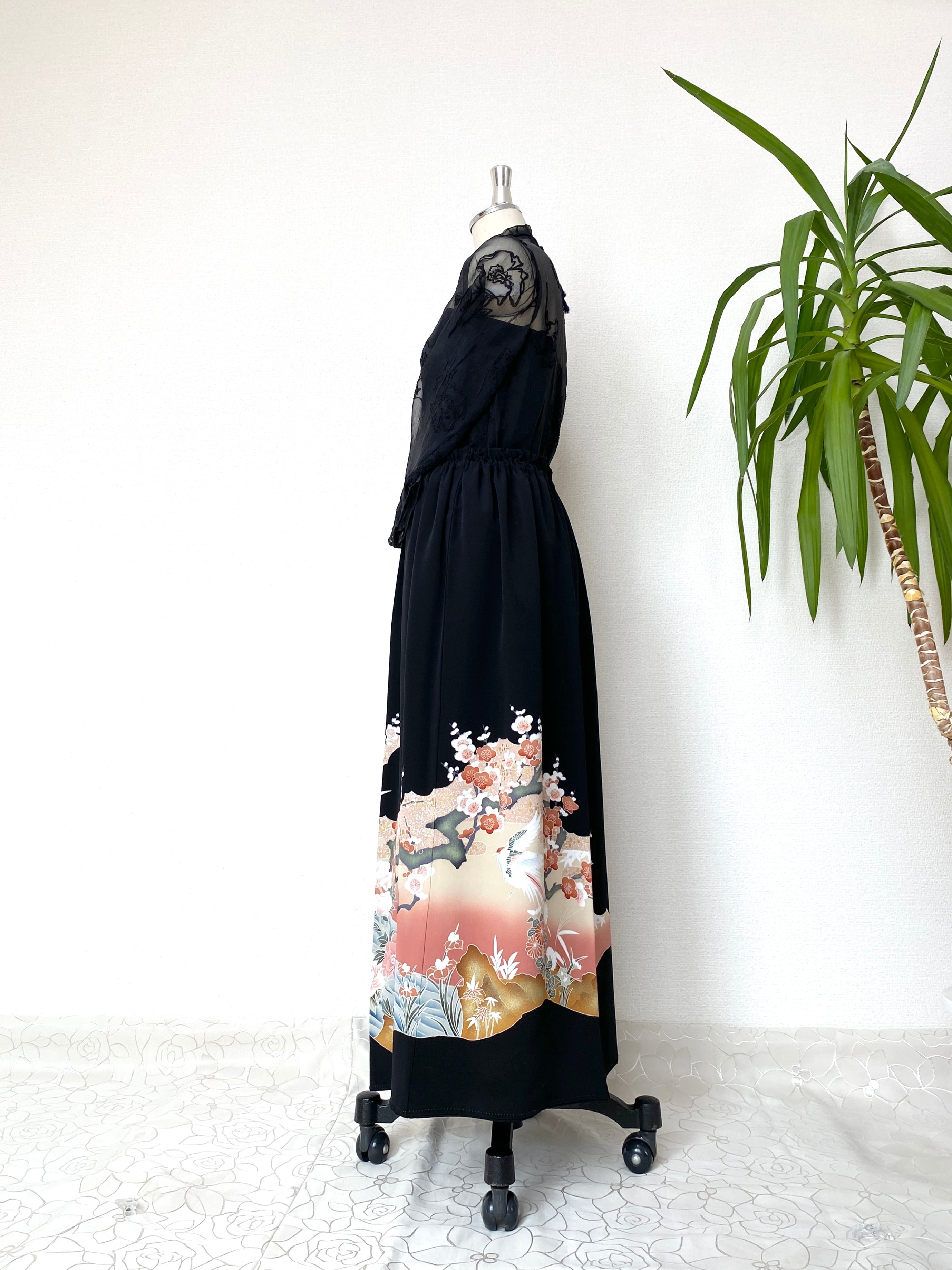 黒留袖着物リメイクウエストゴムロングスカートフリーサイズ