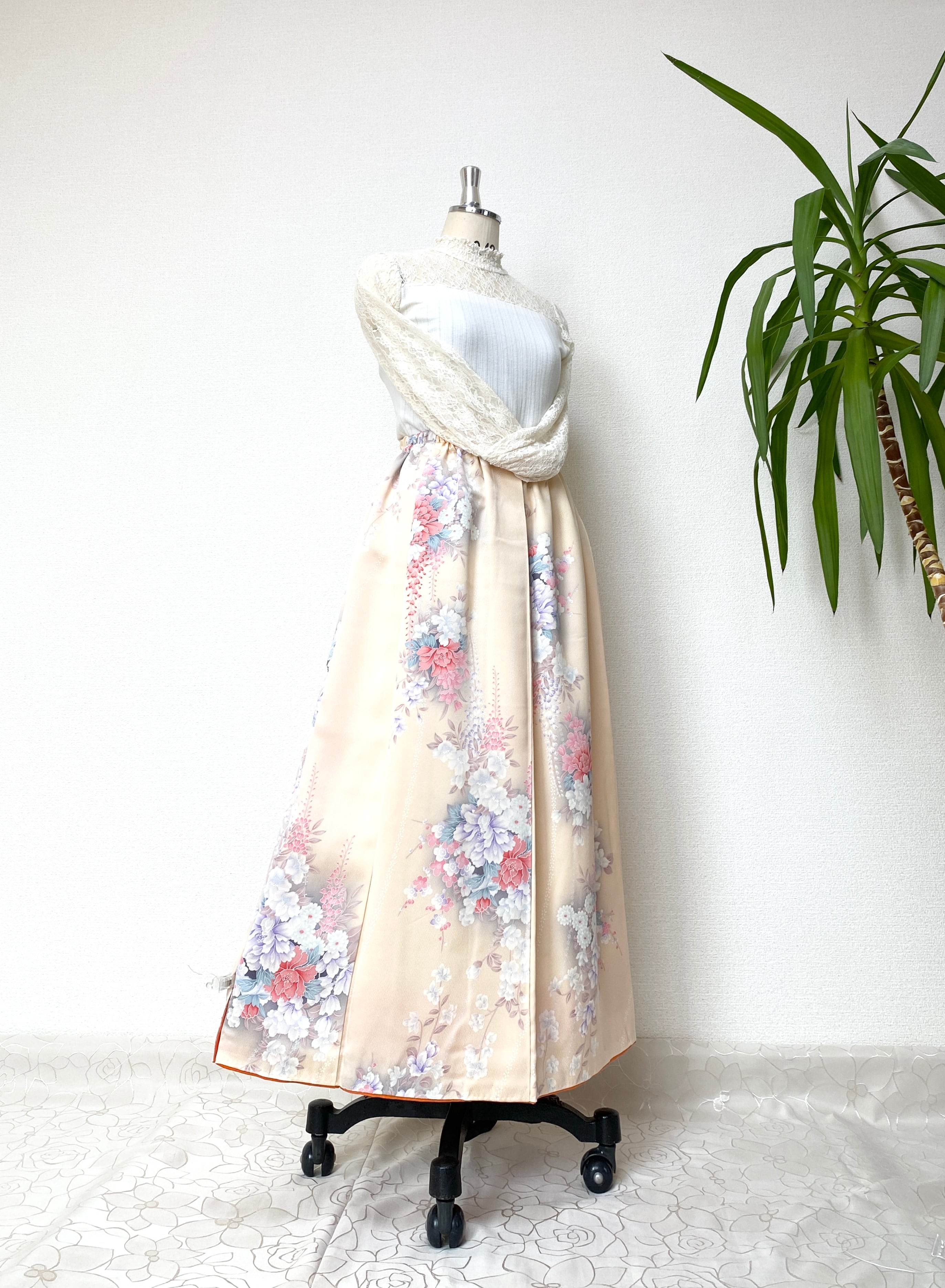 着物をリメイクして作製したウエストゴムロングドレススカートフリーサイズです。