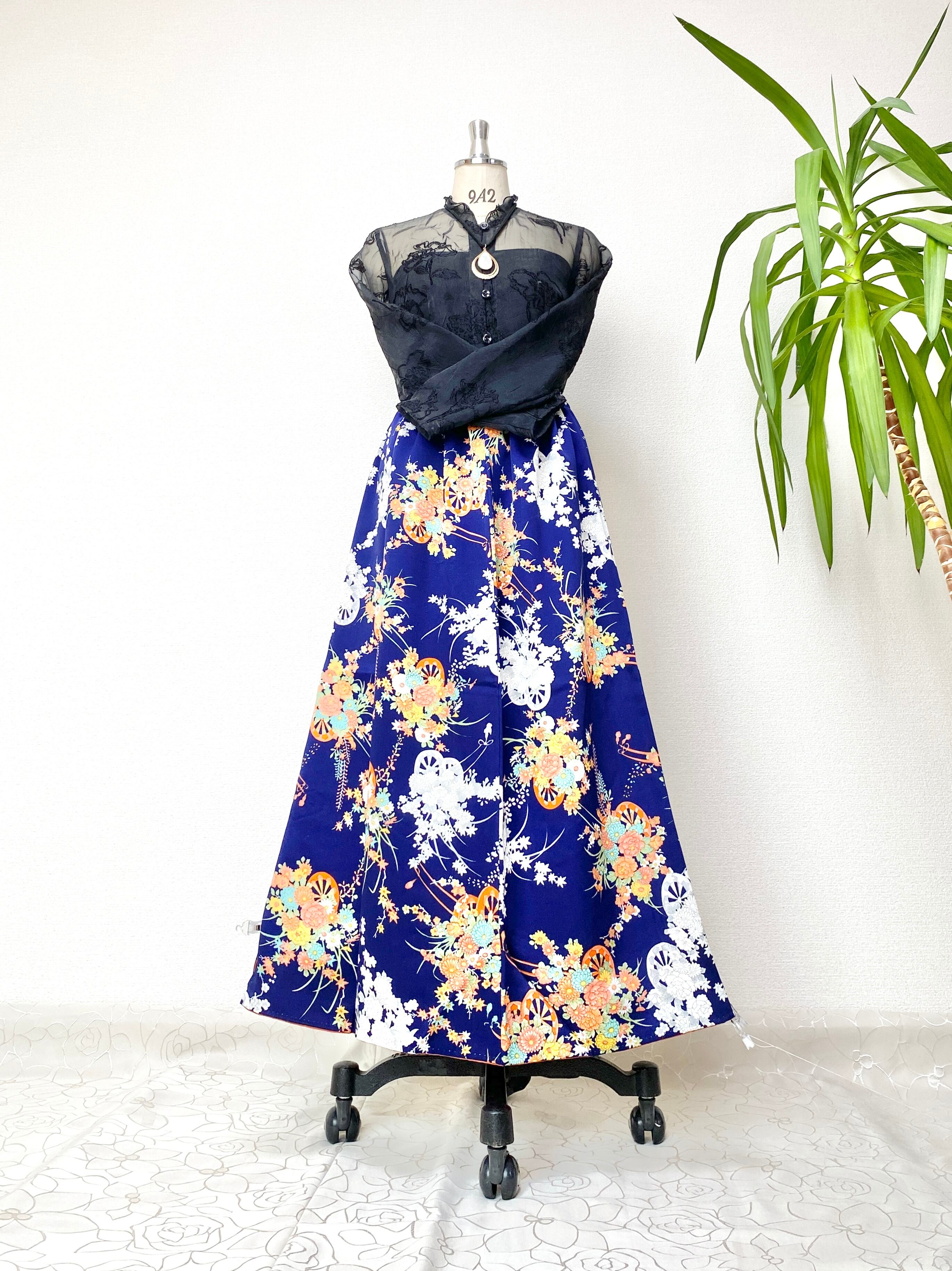 着物をリメイクして作製したウエストゴムロングドレススカートフリーサイズです。