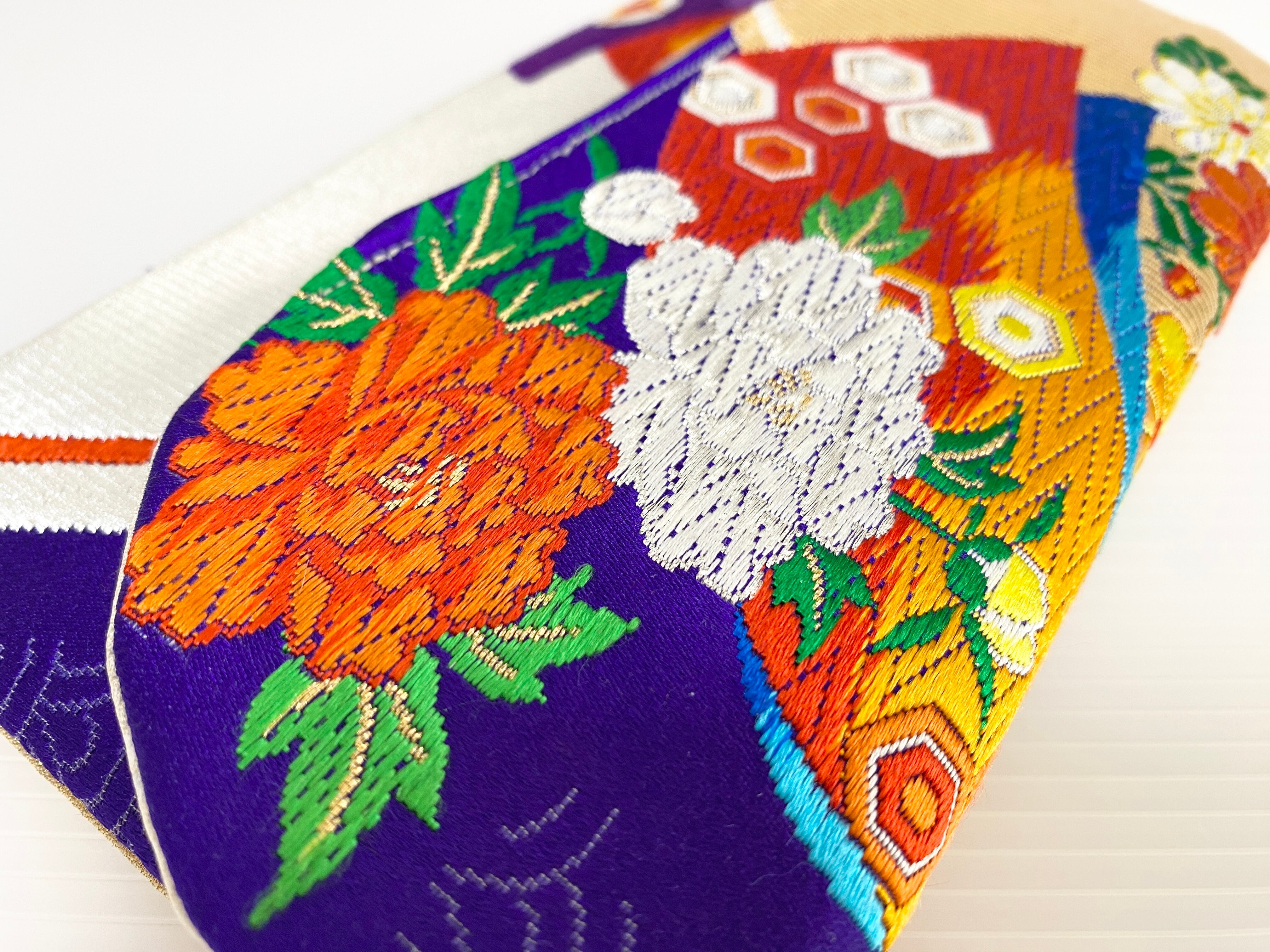 触り心地が滑らかで手にしっくりとくる安心感。絵柄の鮮やかさは日本の着物帯ならではの存在感で素晴らしく華やかな美しさです。