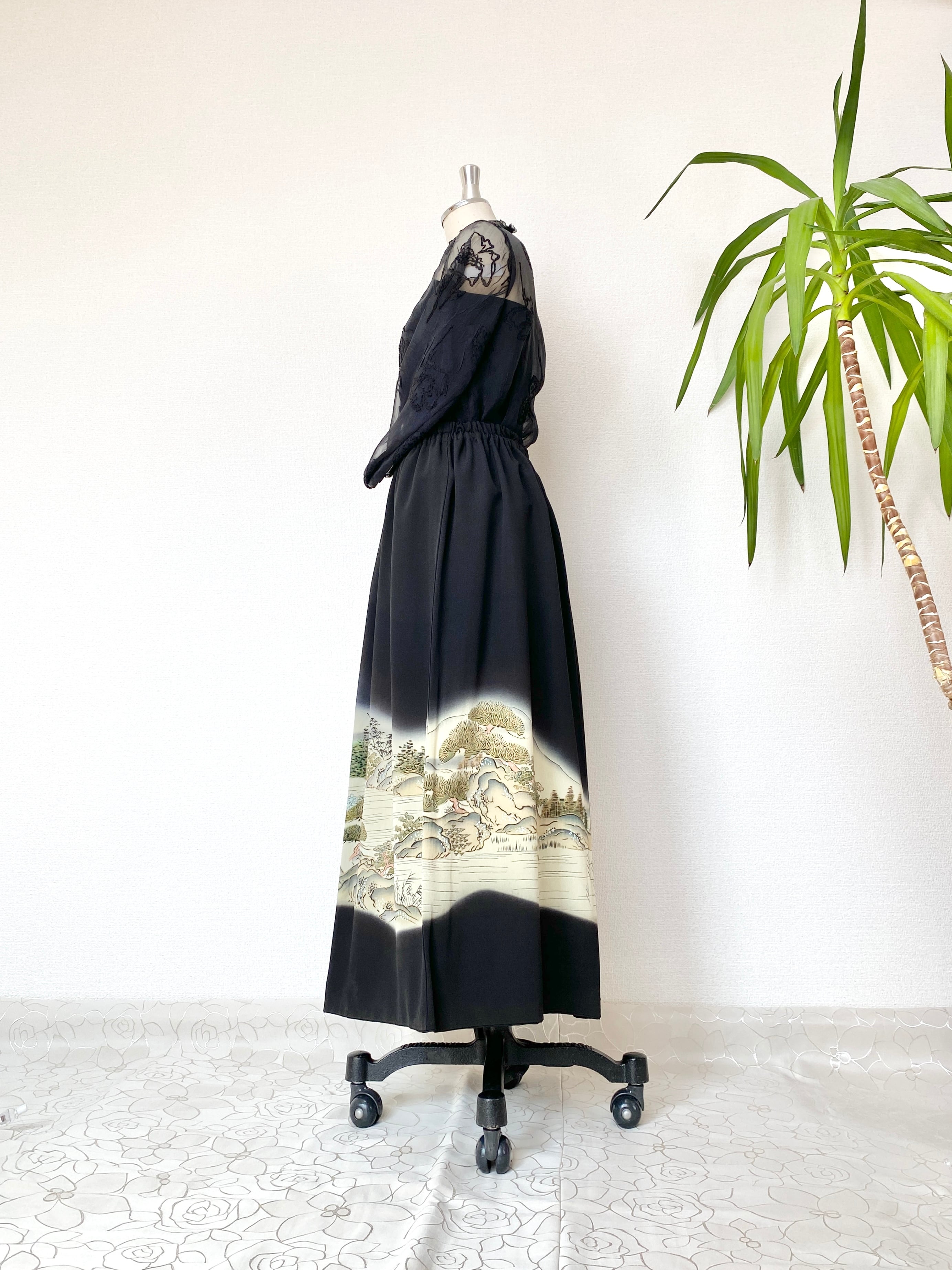 黒留袖着物をリメイクして作製したウエストゴムロングドレススカートフリーサイズです