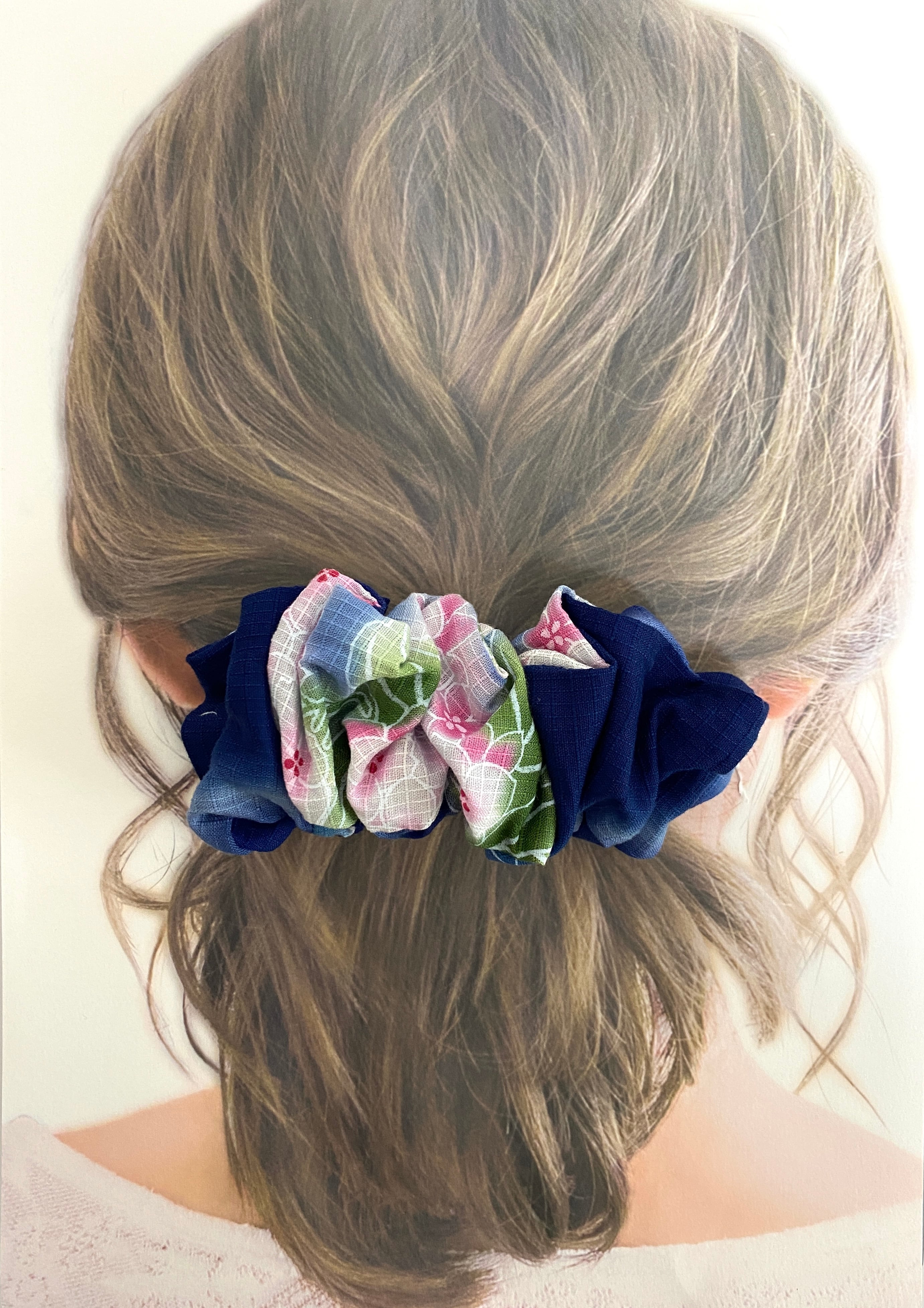 シュシュはお揃いの浴衣の布生地で作成してます。