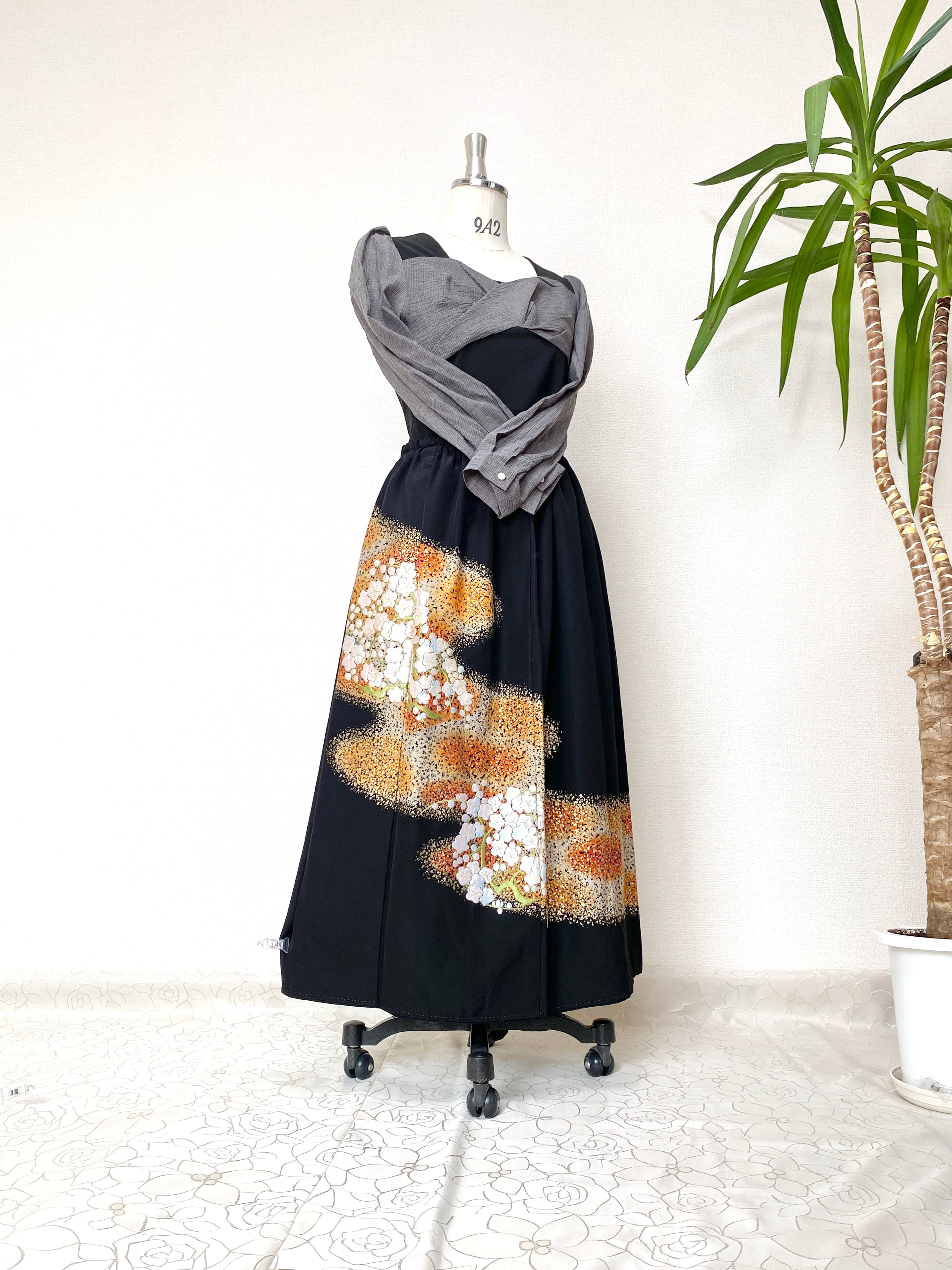 大人可愛いセレブ着物スカートフリーサイズ黒留袖着物リメイクウエストゴムロングスカート