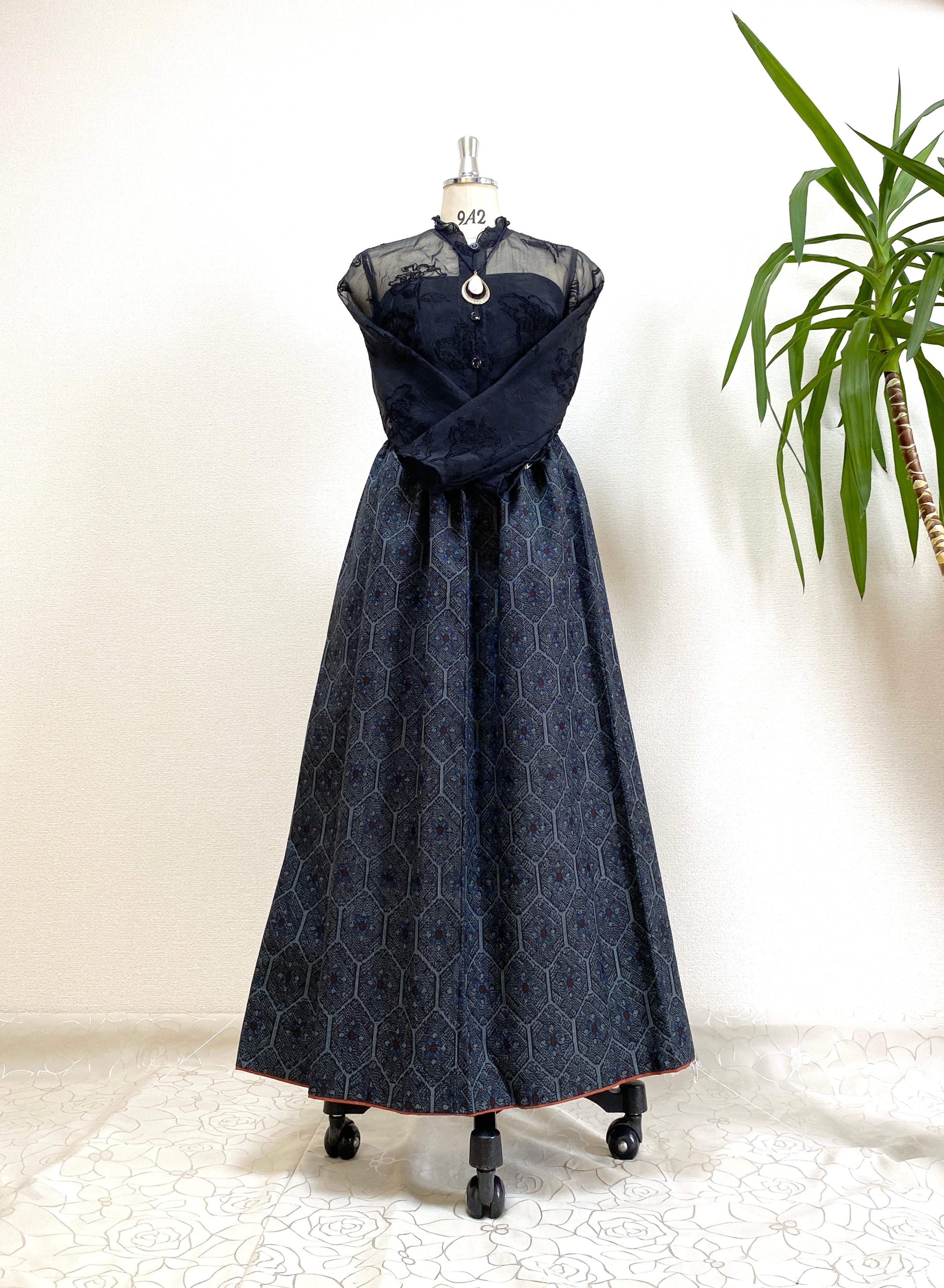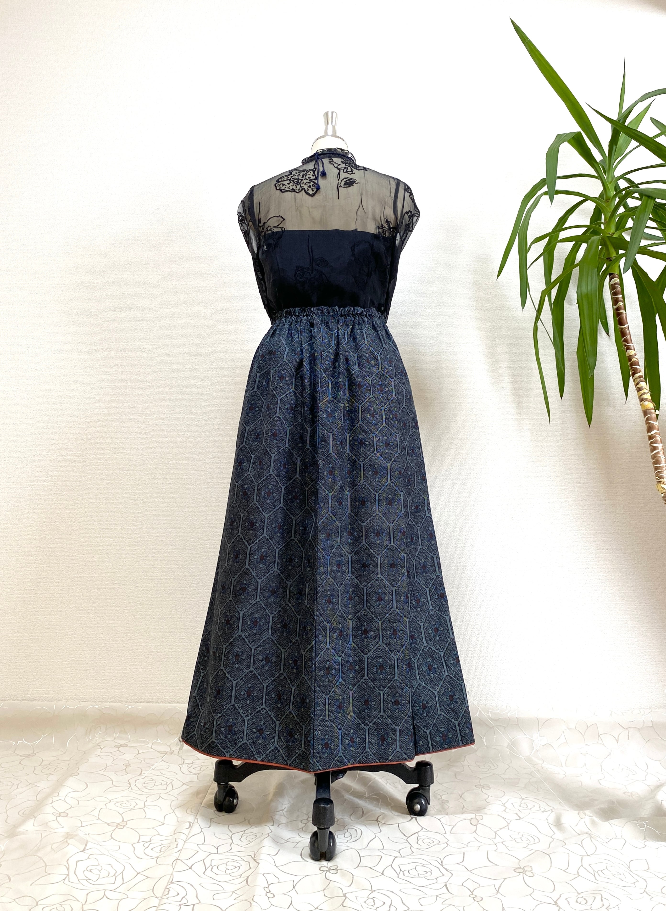 大島紬の着物をリメイクして作製したウエストゴムロングドレススカートフリーサイズです。