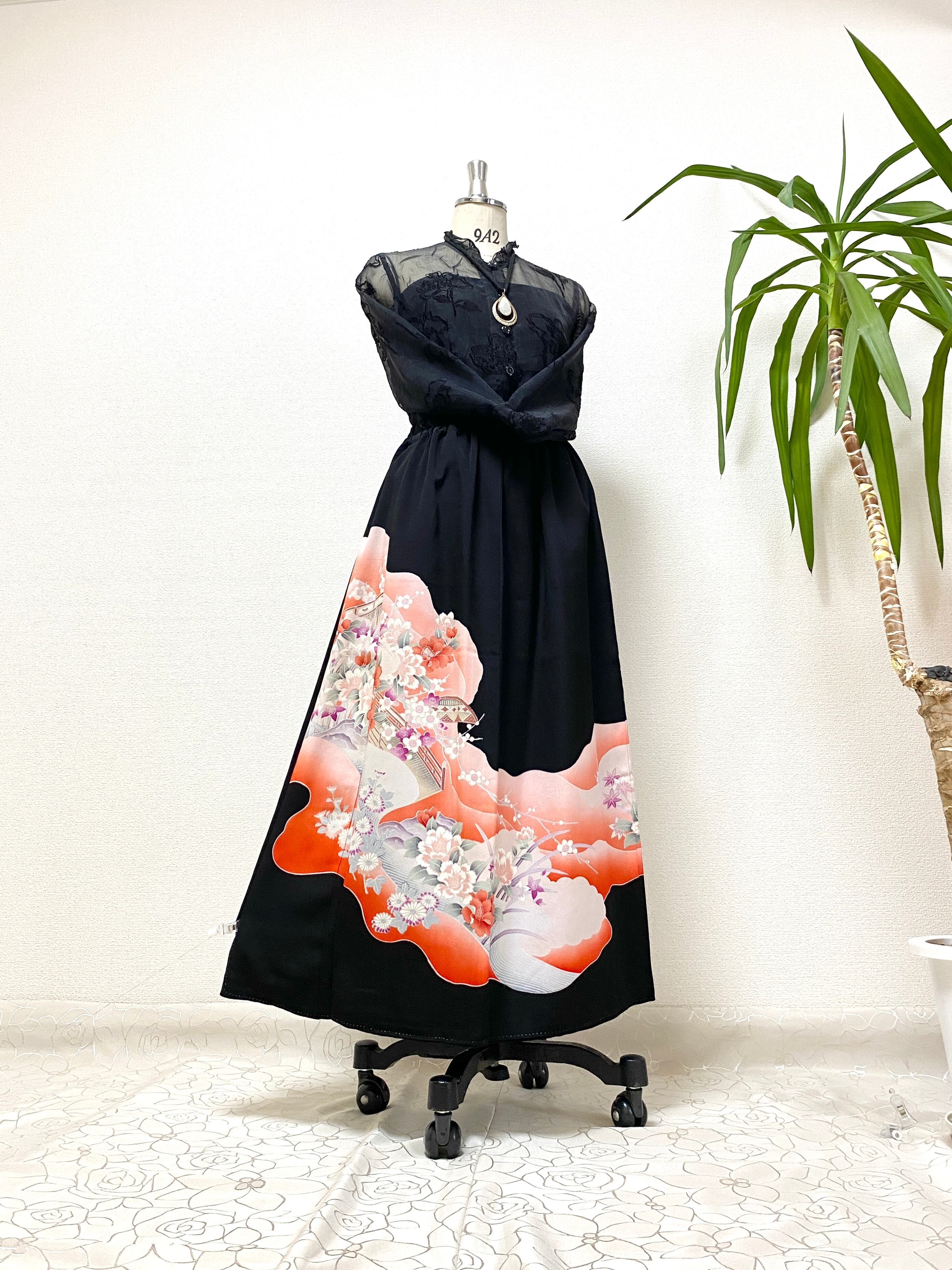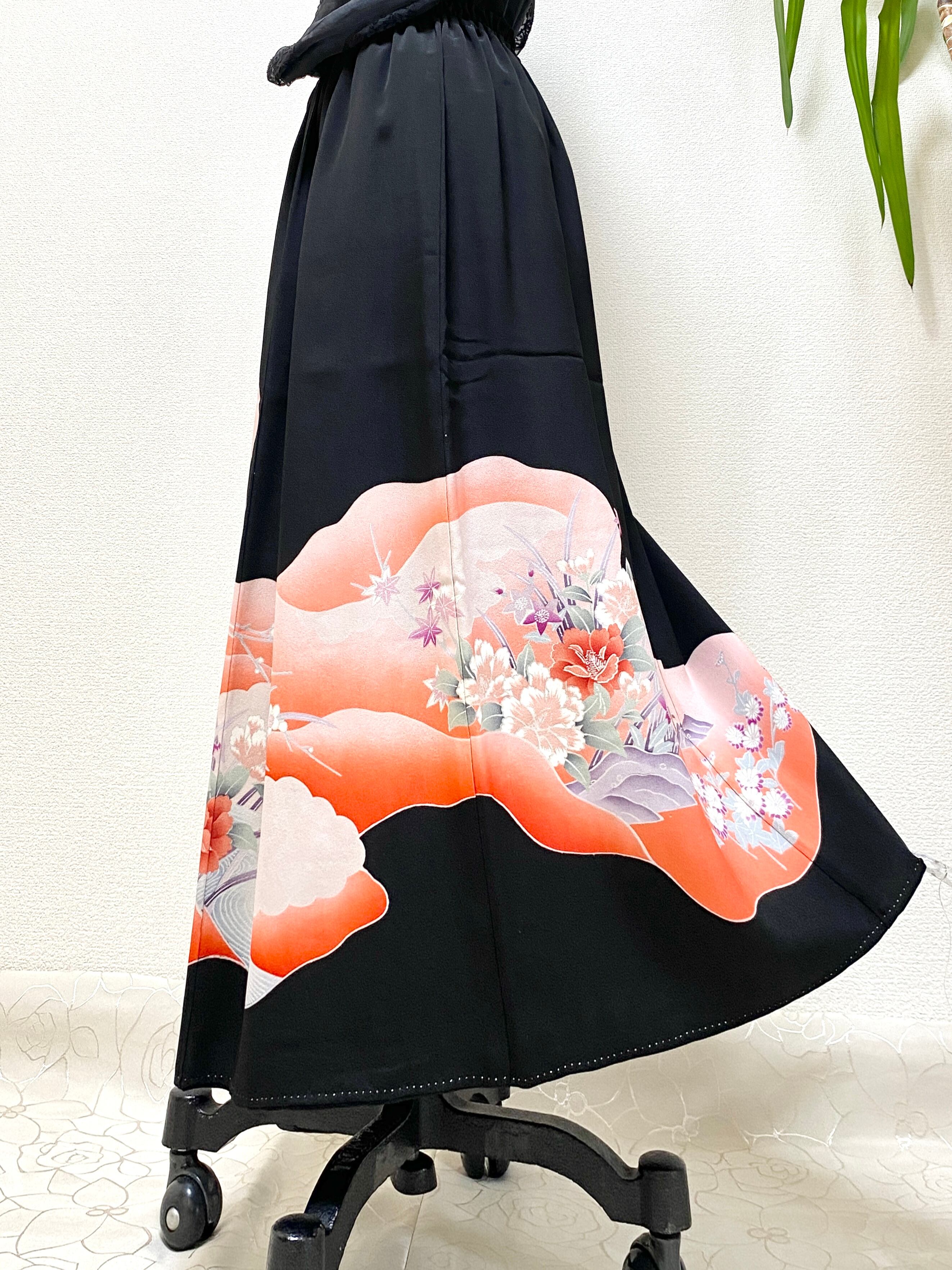大人可愛いセレブ着物スカートフリーサイズ1点物黒留袖着物リメイクウエストゴムロングスカート