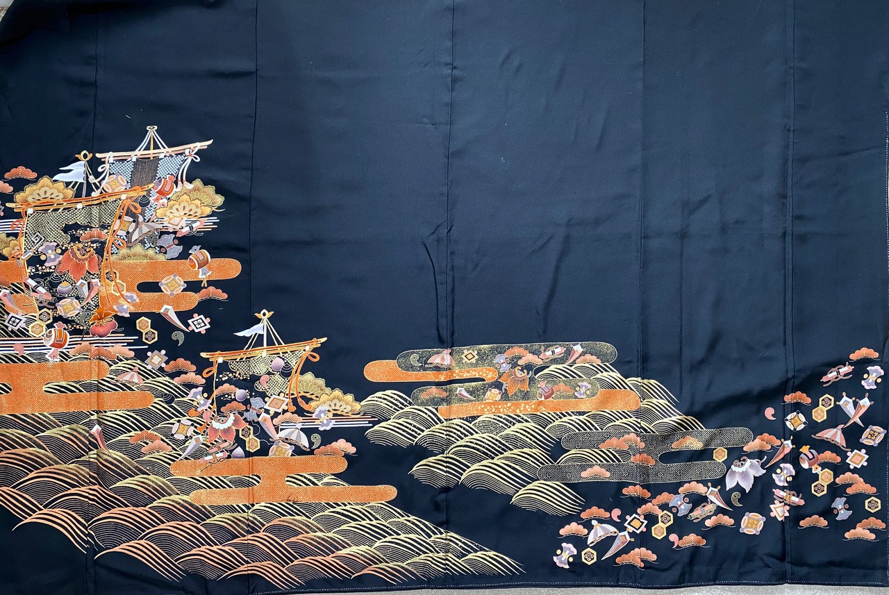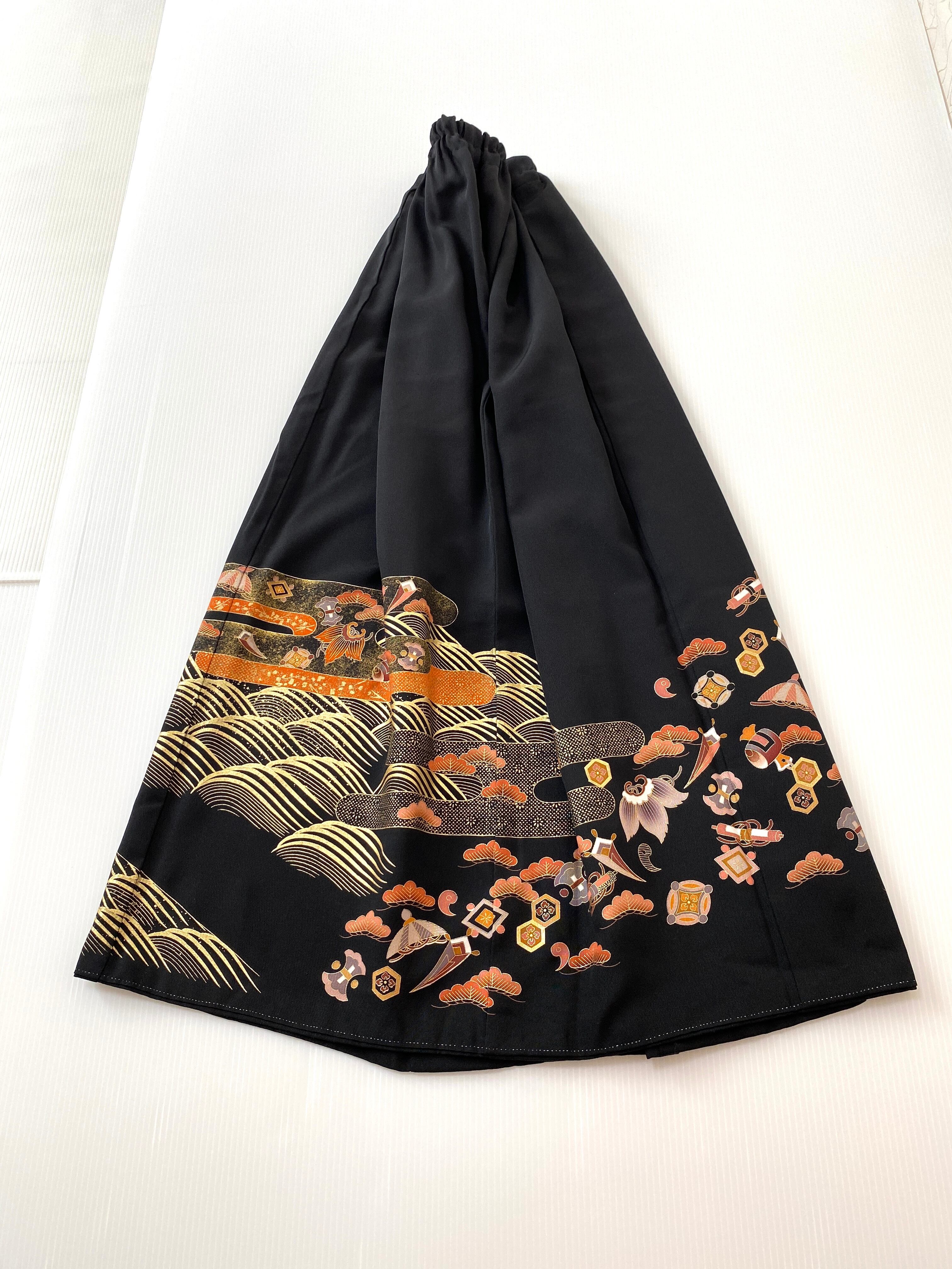 黒留袖着物をリメイクして作製したウエストゴムロングドレススカートフリーサイズ【超ロング丈】です。