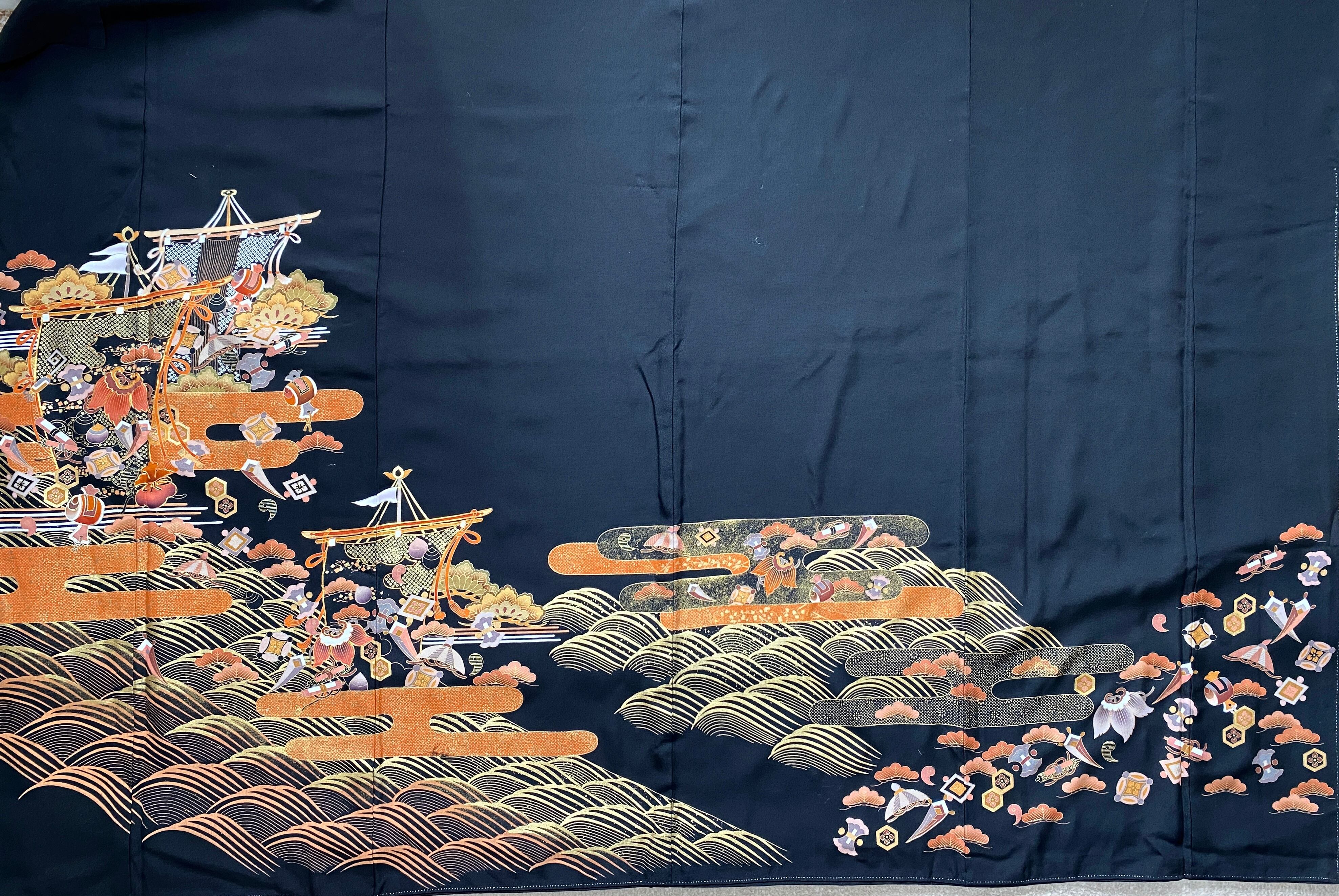 黒留袖着物リメイクウエストゴムロングスカート【超ロング丈】フリーサイズ送料無料ハンドメイド黒留袖着物リメイクウエストゴムロングスカート【超ロング丈】フリーサイズNO.1917