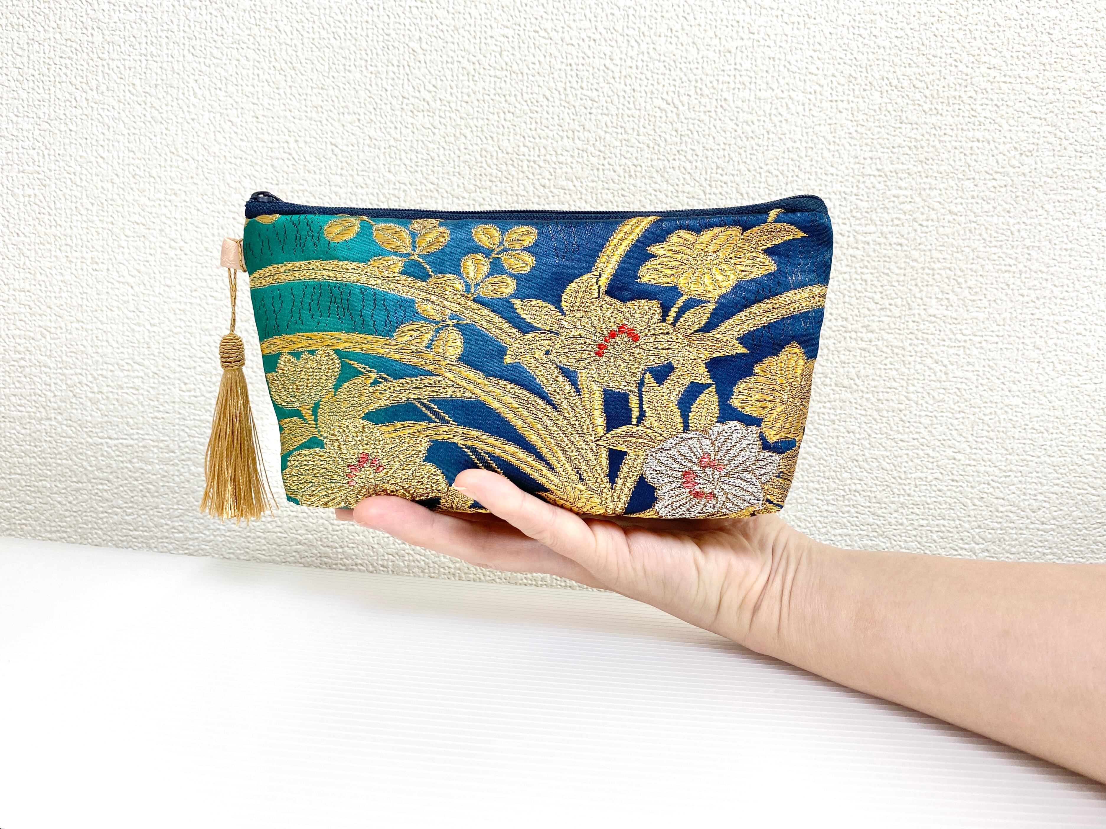 内側の裏生地にも着物帯を使用しておりますのでしっかりとした造りの帯リメイクポーチです。
