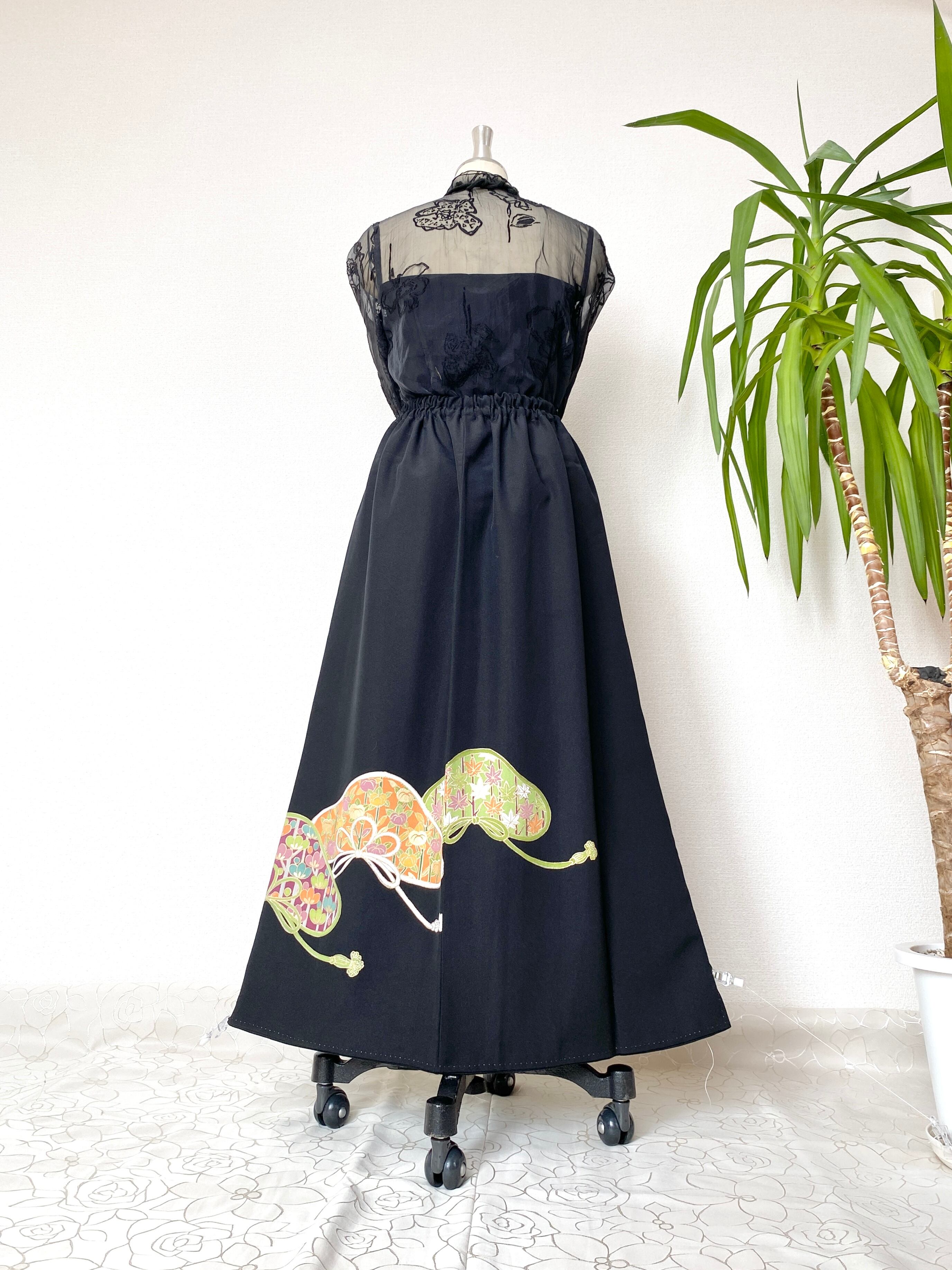 黒留袖着物リメイクウエストゴムロングドレススカートフリーサイズ【超ロング丈】
