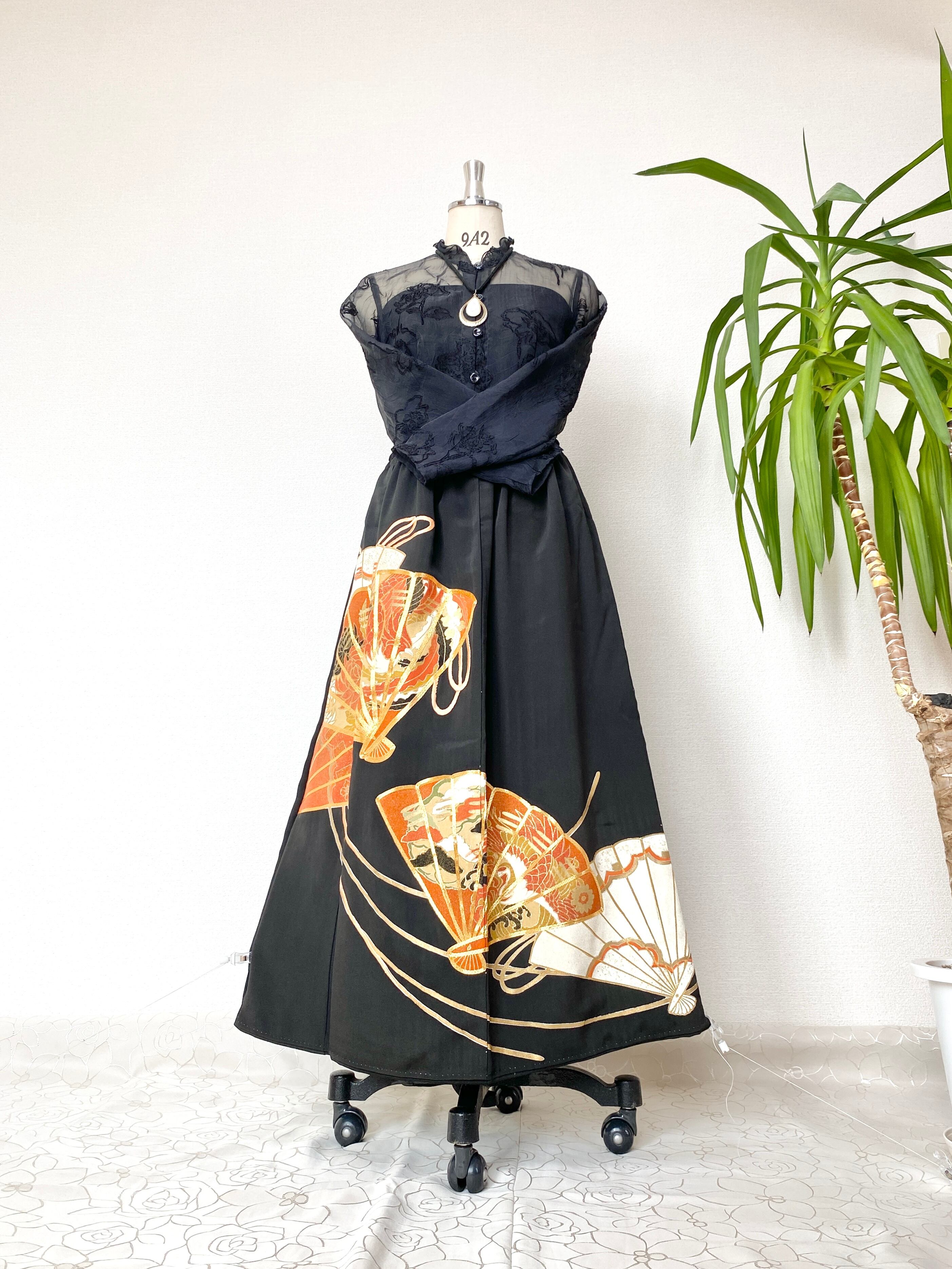 大人可愛いセレブ着物スカートフリーサイズ1点物黒留袖着物リメイクウエストゴムロングスカート