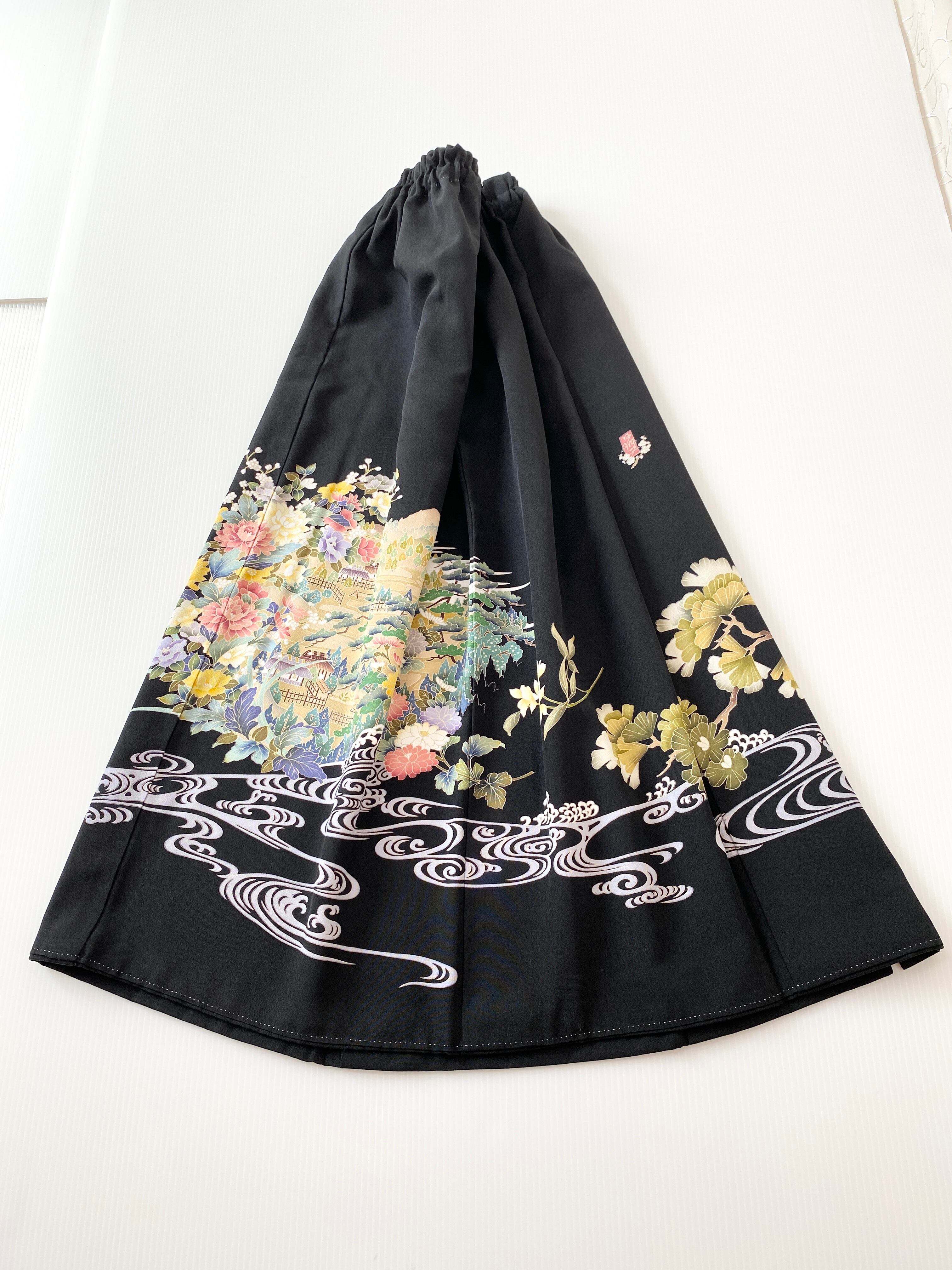 セレブ着物スカートフリーサイズ大人可愛いロングスカート黒留袖着物リメイクウエストゴムロングスカートフリーサイズハンドメイド送料込みNO.2160
