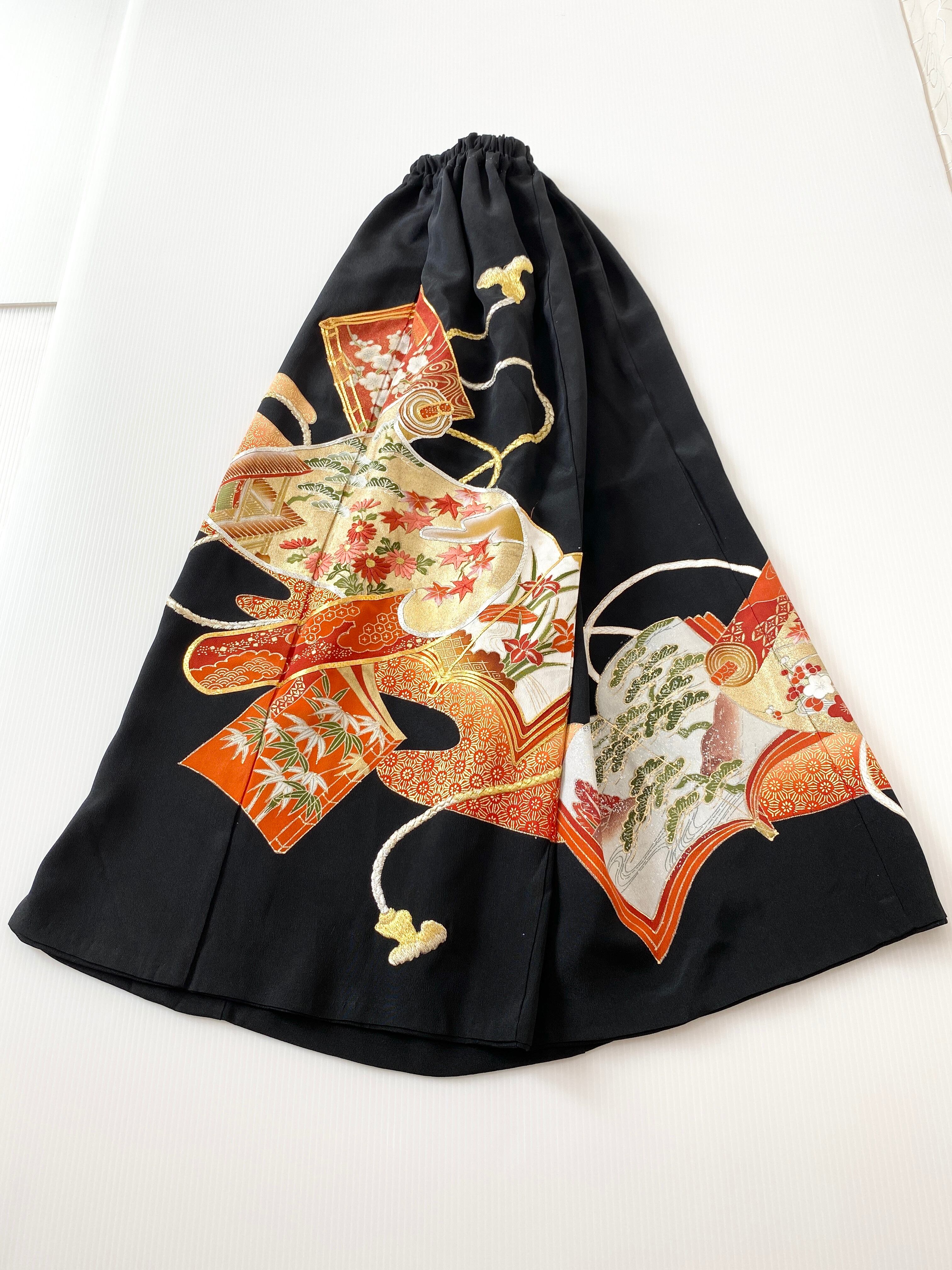 セレブ着物スカートフリーサイズ大人可愛いロングスカート黒留袖着物リメイクウエストゴムロングスカートフリーサイズハンドメイド送料込みNO.2161