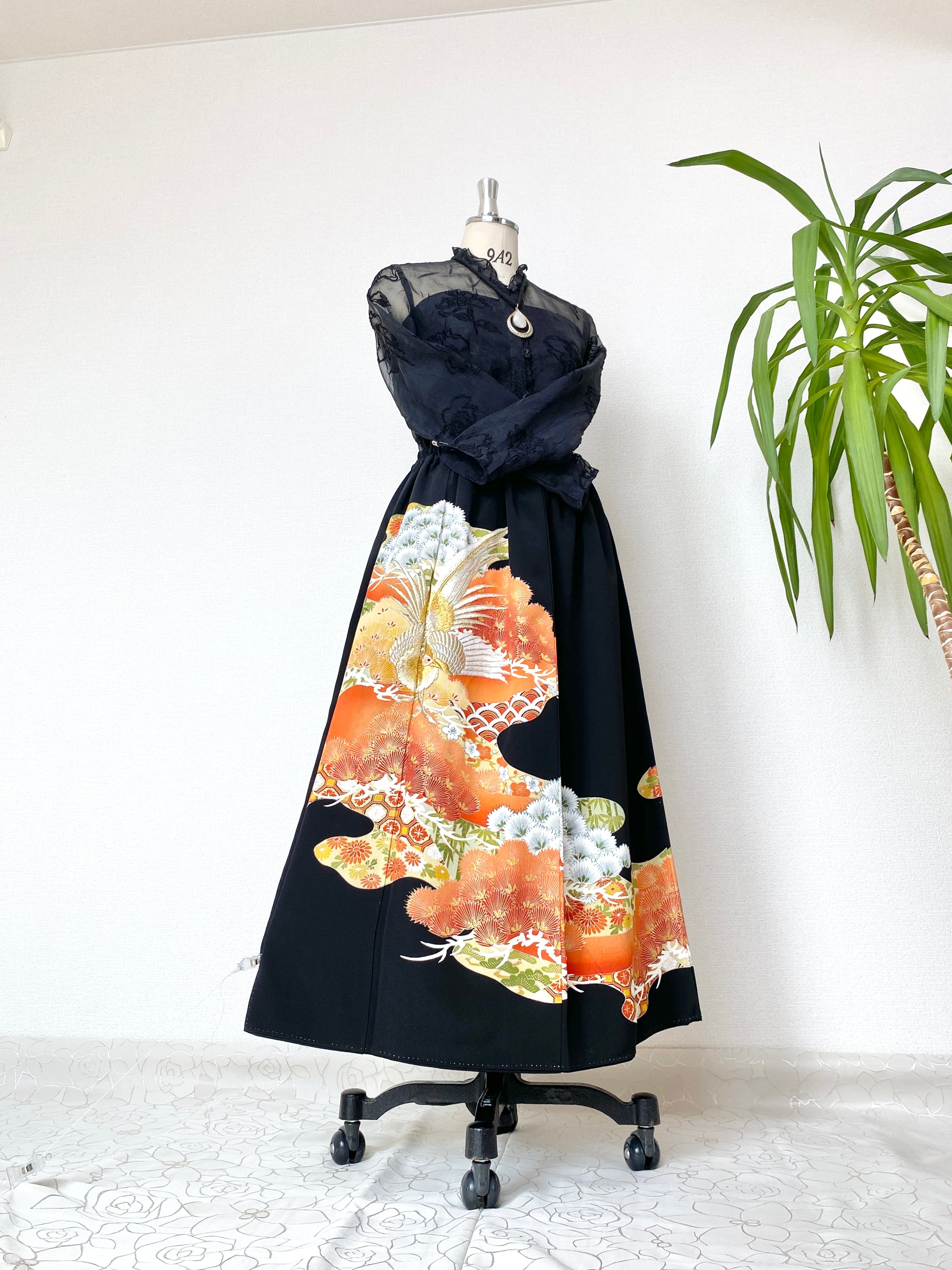 黒留袖着物をリメイクして作製したウエストゴムロングドレススカートフリーサイズです。