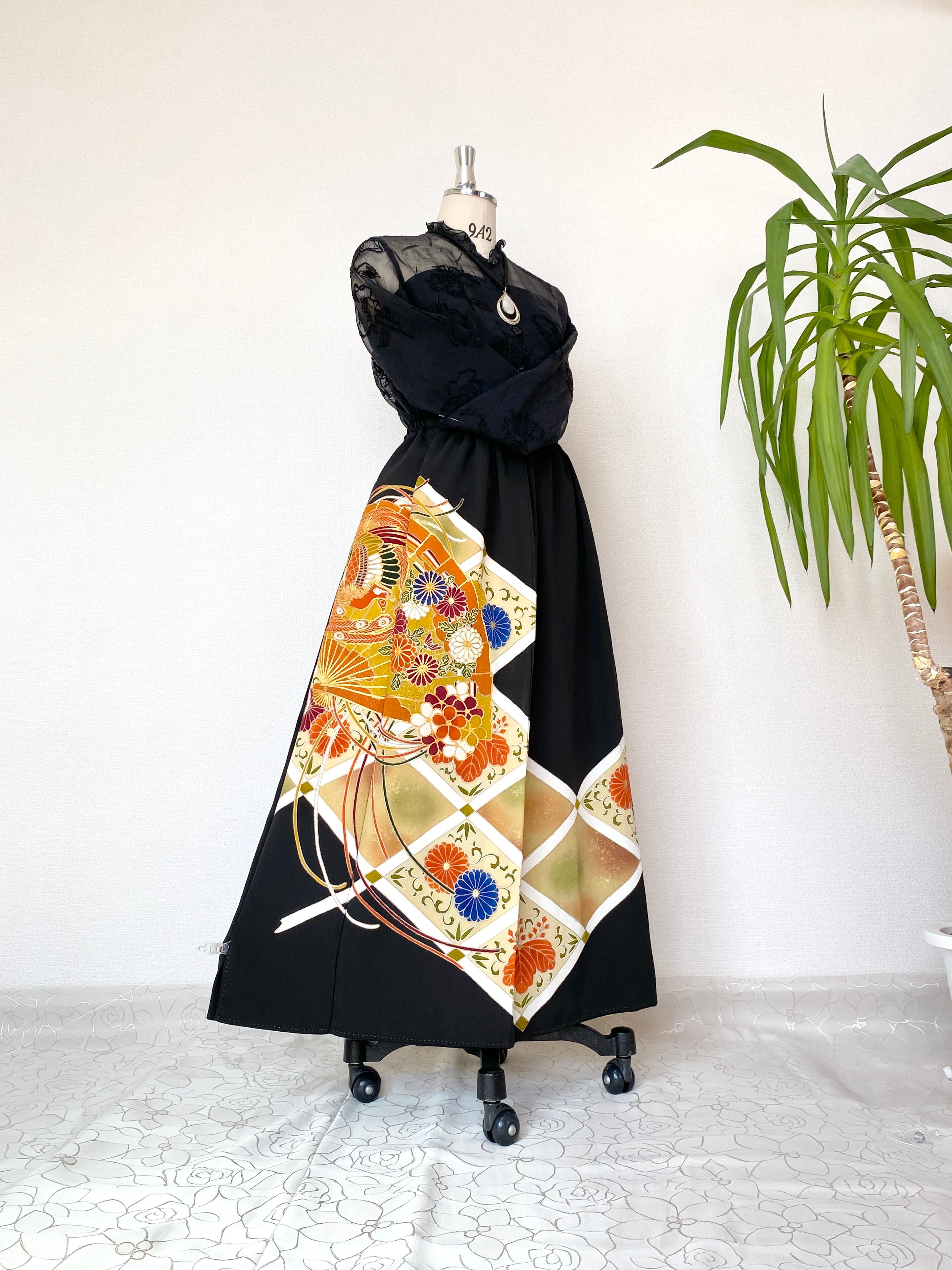 【訳あり】セレブ着物スカートフリーサイズ黒留袖着物リメイクウエストゴムロングスカート