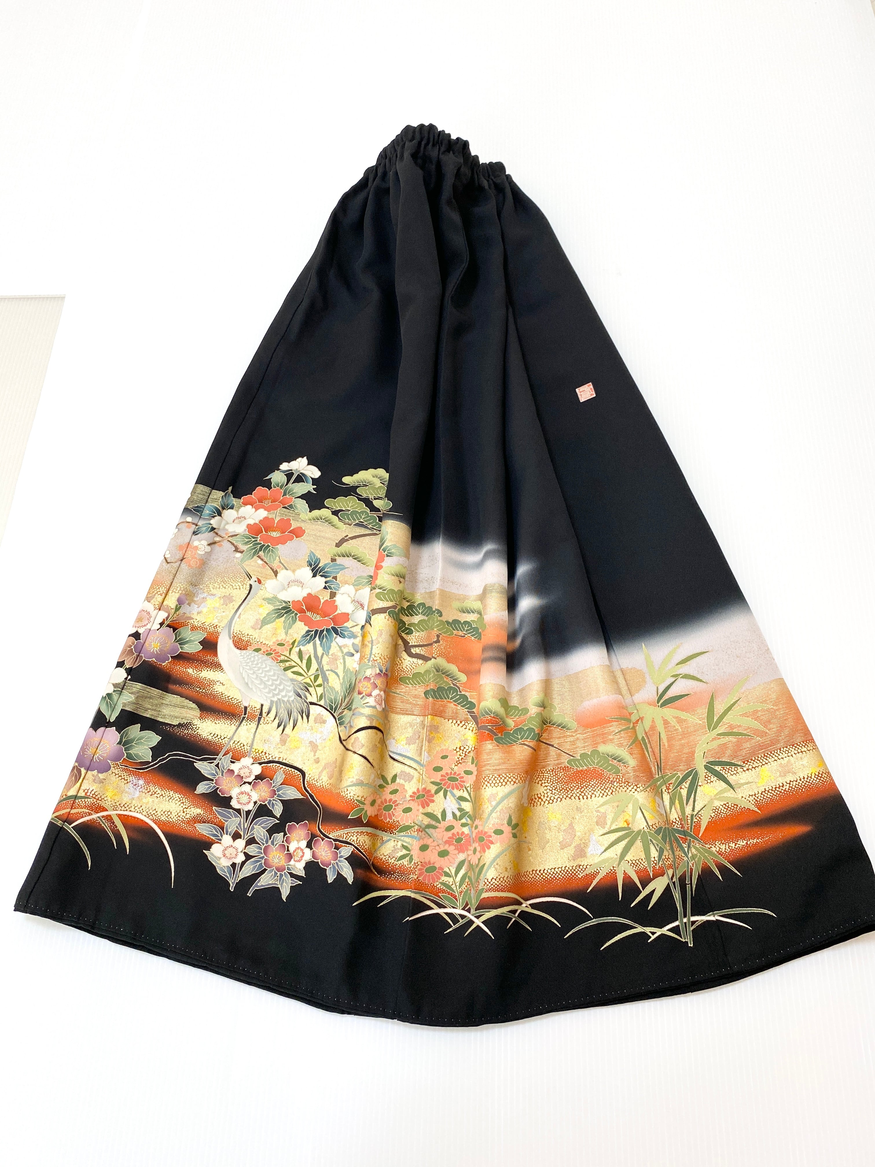 黒留袖着物をリメイクして作製したウエストゴムロングドレススカートフリーサイズです。