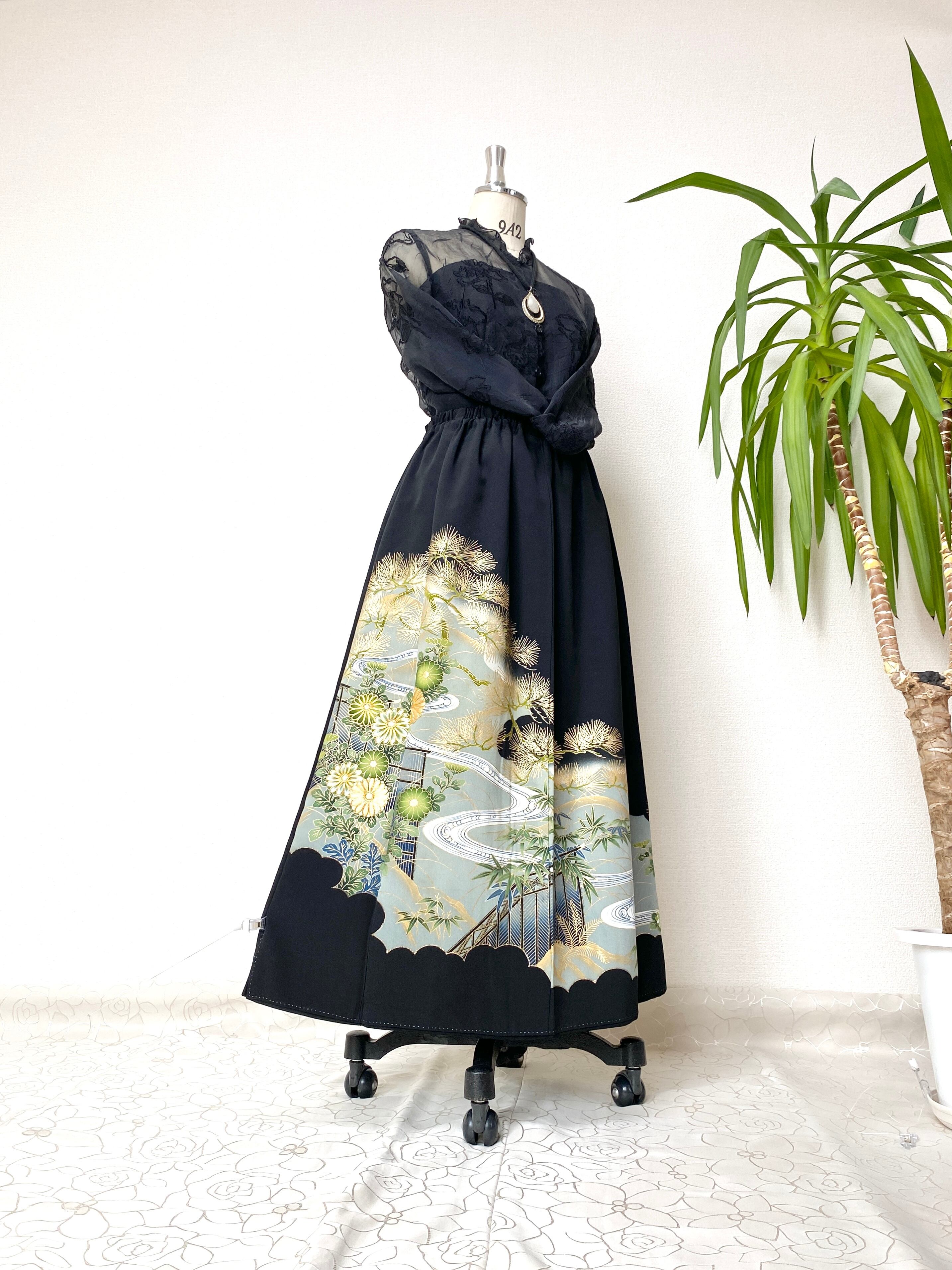 セレブ着物スカートフリーサイズ1点物黒留袖着物リメイクウエストゴムロングスカートハンドメイド大人可愛いセレブスカートNO.2211