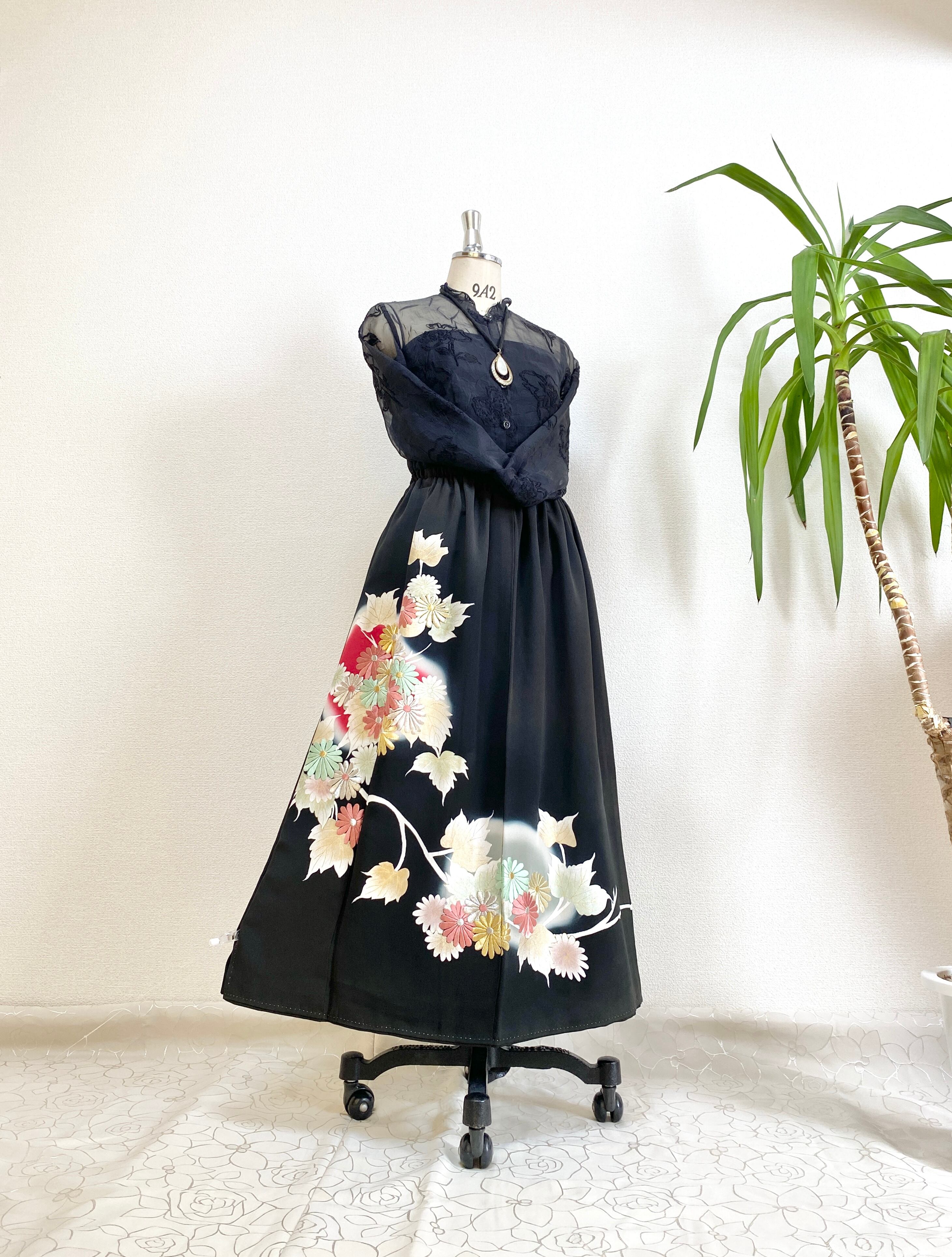 大人可愛いセレブ着物スカートフリーサイズ1点物黒留袖着物リメイクウエストゴムロングスカートフリーサイズNO.2225