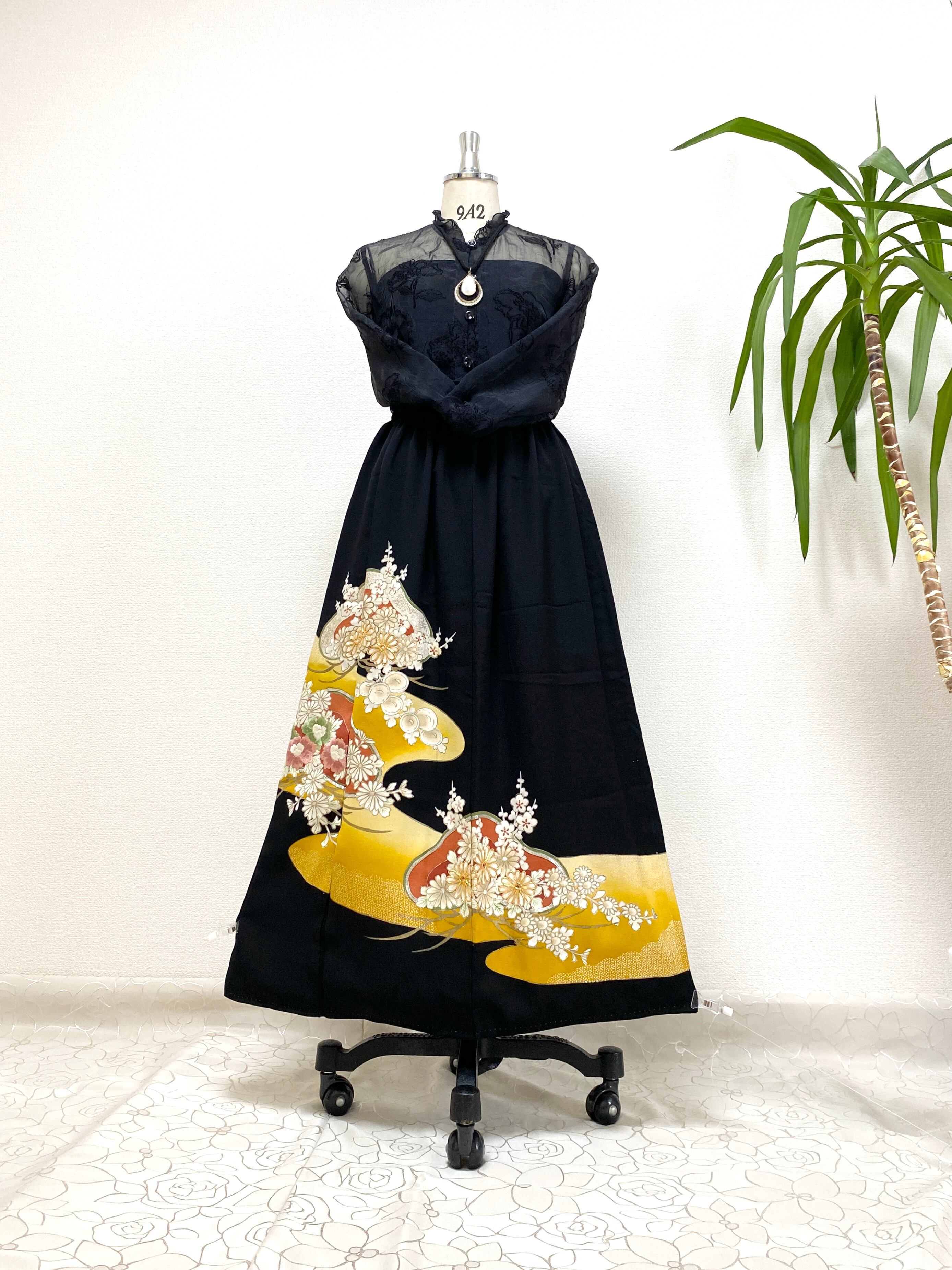大人可愛いセレブ着物スカートフリーサイズ黒留袖着物リメイクウエストゴムロングスカート
