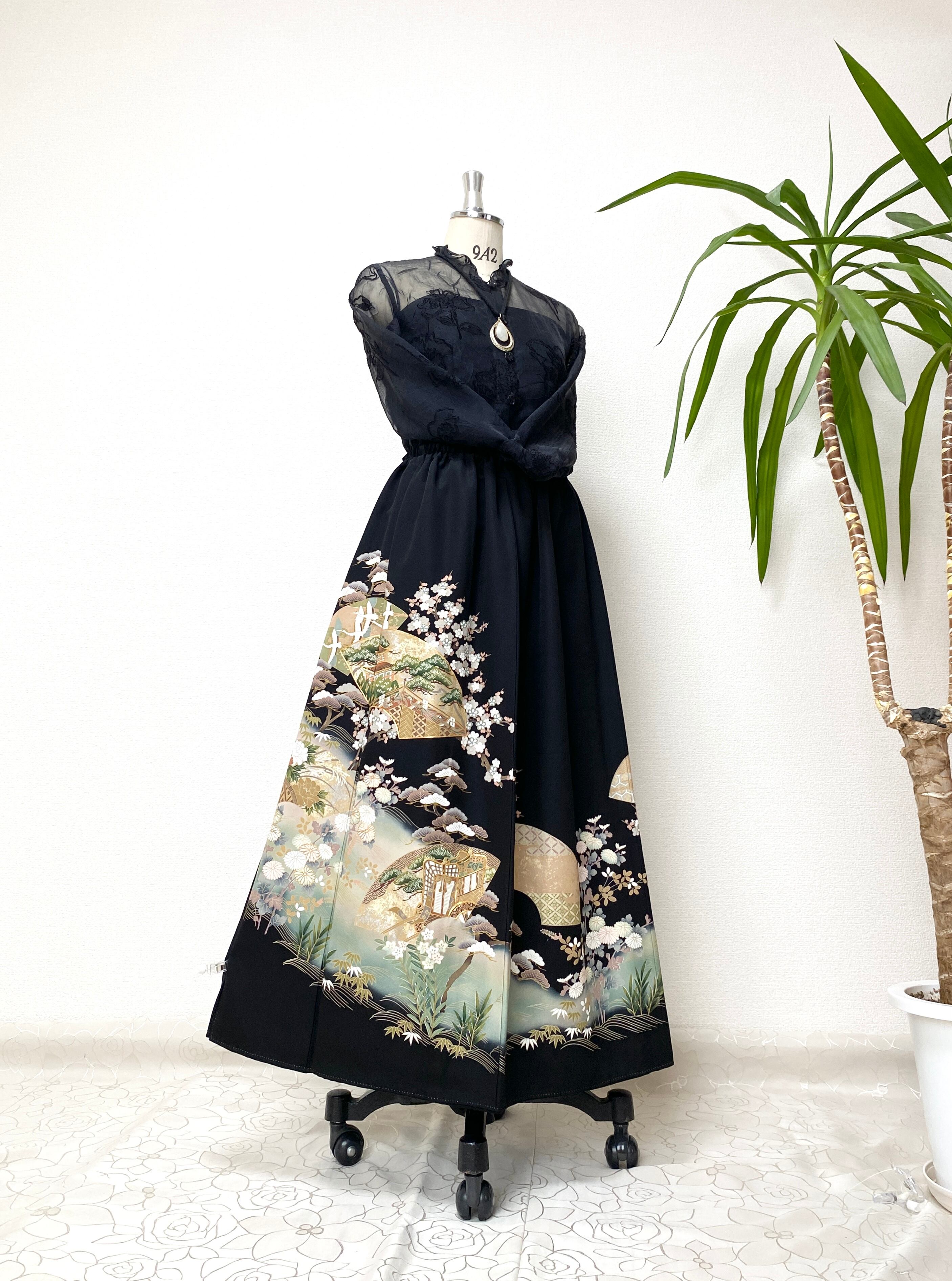 大人可愛いセレブ着物スカートフリーサイズ1点物黒留袖着物リメイクウエストゴムロングスカート