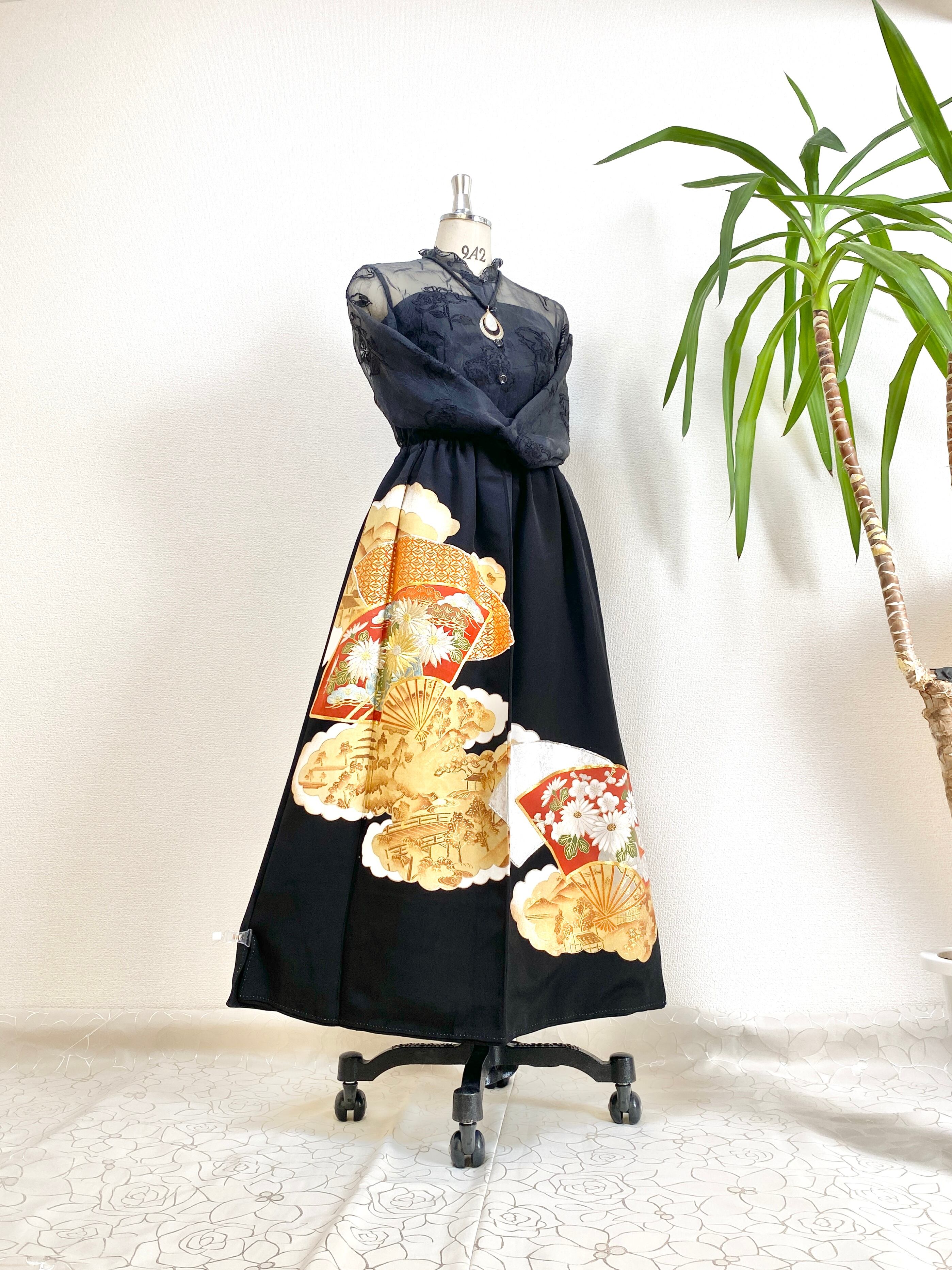 大人可愛いセレブ着物スカートフリーサイズ1点物黒留袖着物リメイクウエストゴムロングスカート
