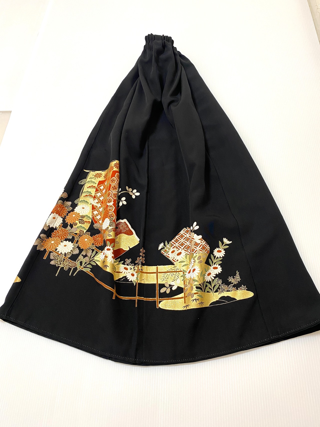 黒留袖着物をリメイクして作製したウエストゴムロングドレススカートフリーサイズです。
