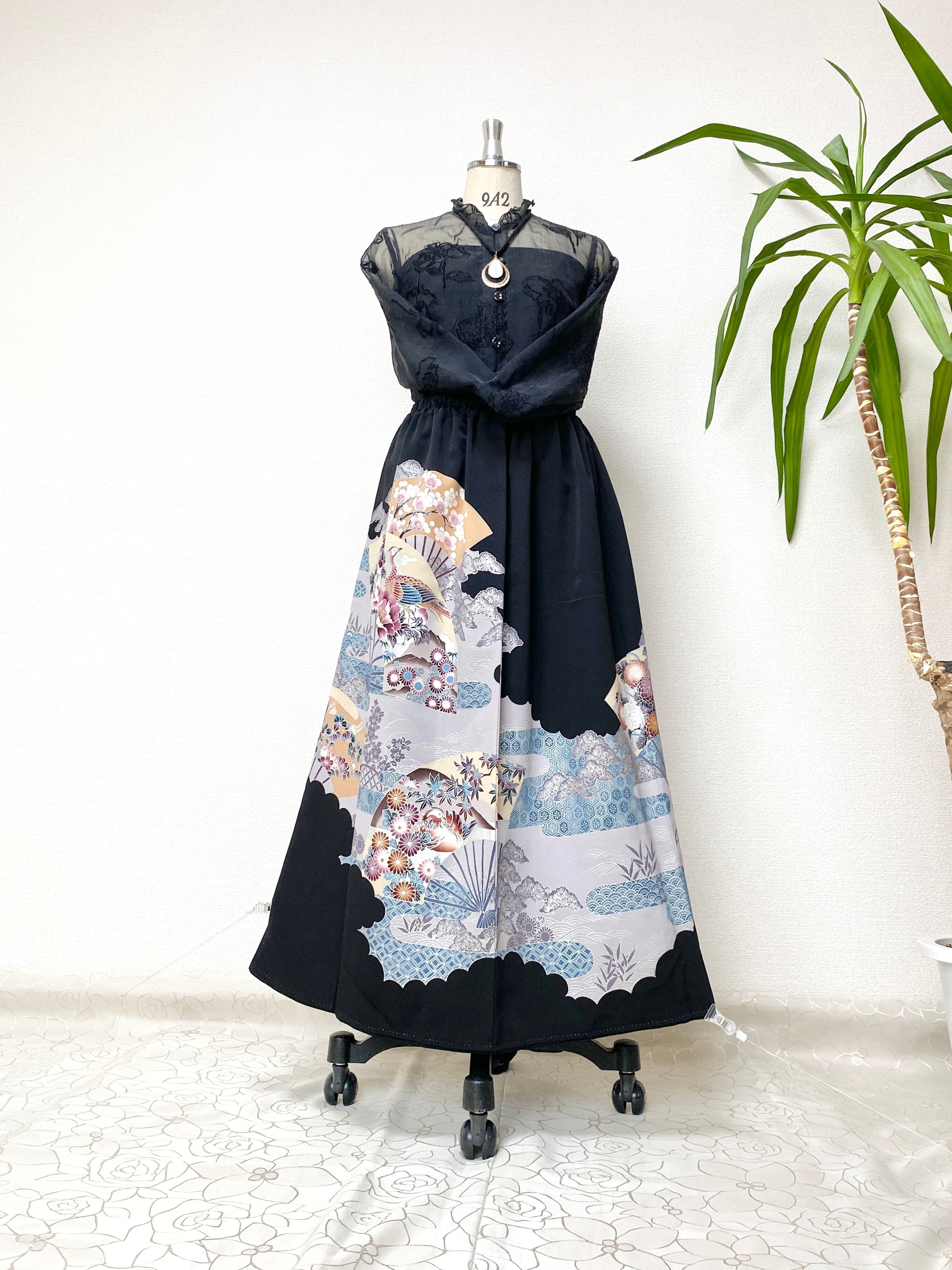 大人可愛いセレブ着物スカートフリーサイズ1点物黒留袖着物リメイクウエストゴムロングスカート