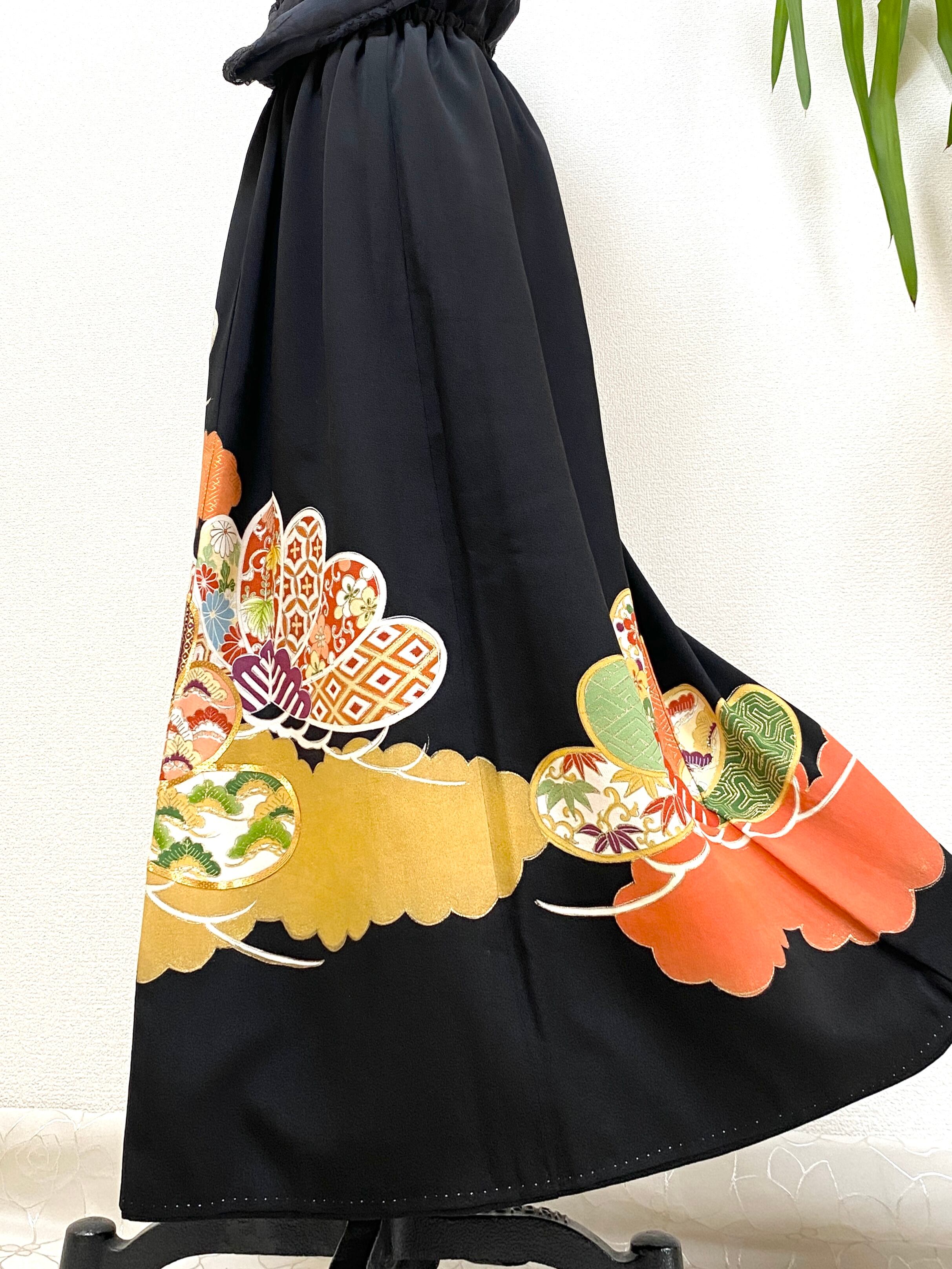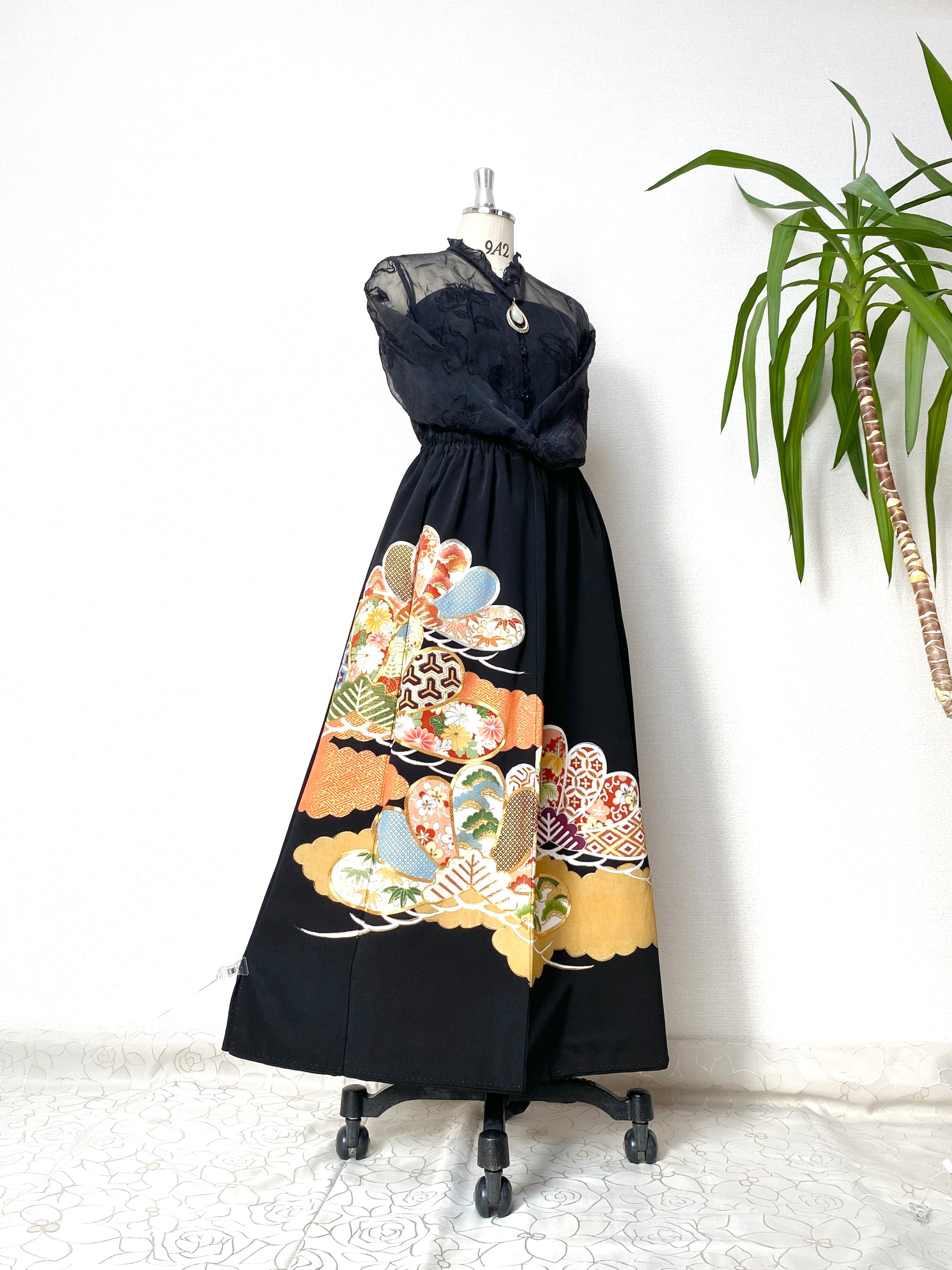 大人可愛いセレブ着物スカートフリーサイズ1点物黒留袖着物リメイクウエストゴムロングスカート