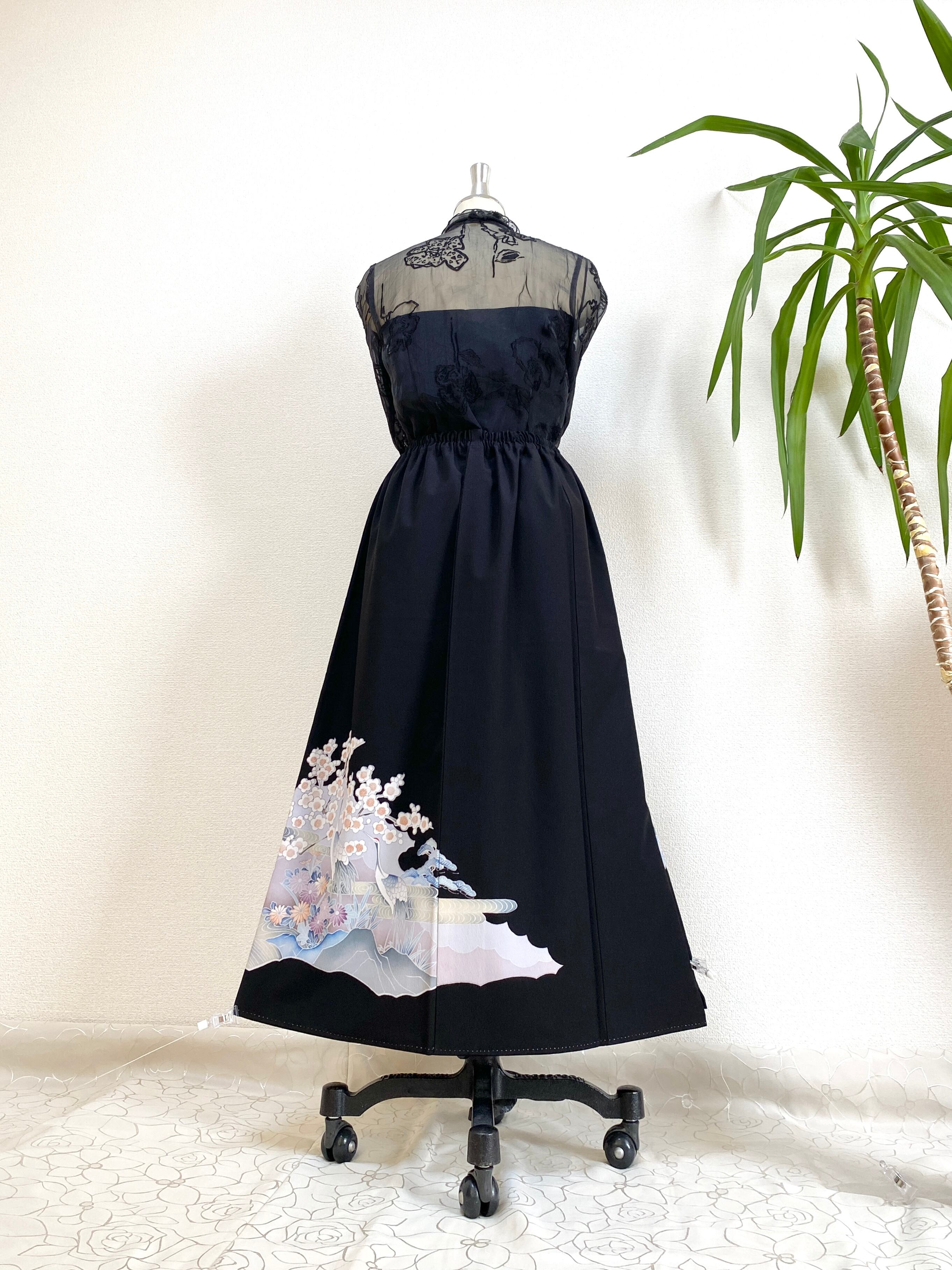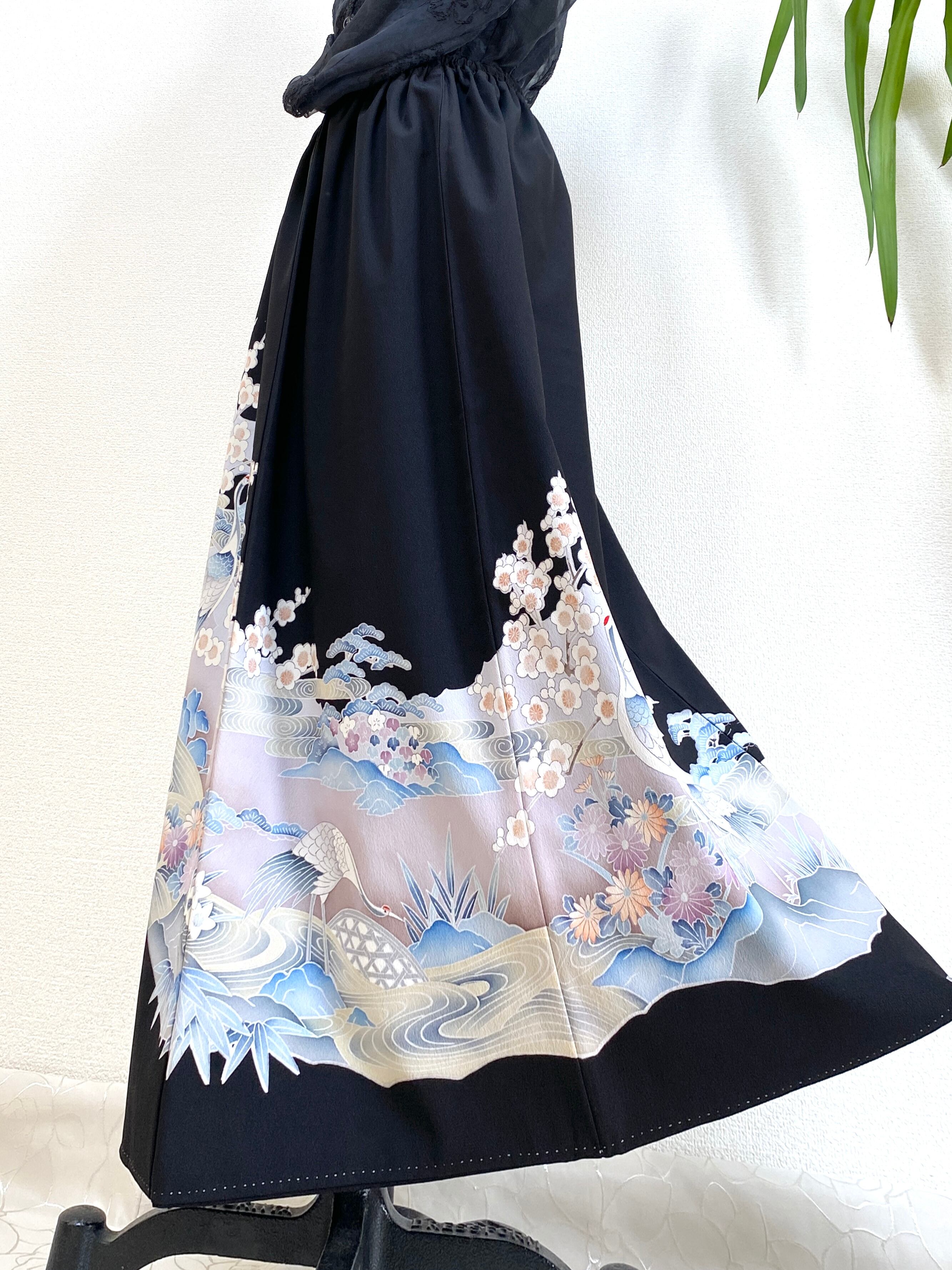 大人可愛いセレブ着物スカートフリーサイズ1点物黒留袖着物リメイクウエストゴムロングスカート