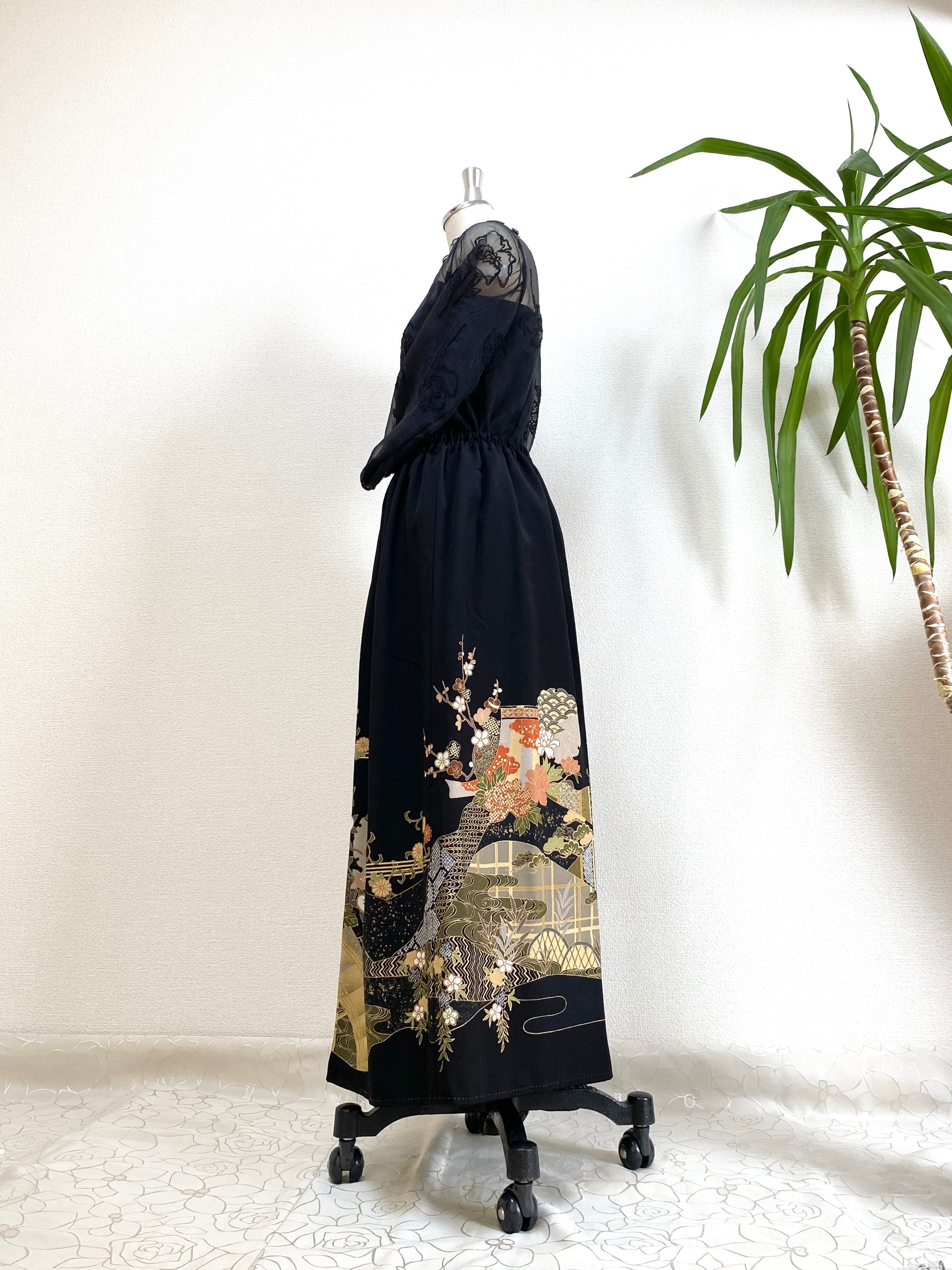 大人可愛いセレブ着物スカートフリーサイズ1点物黒留袖着物リメイクウエストゴムロングスカート