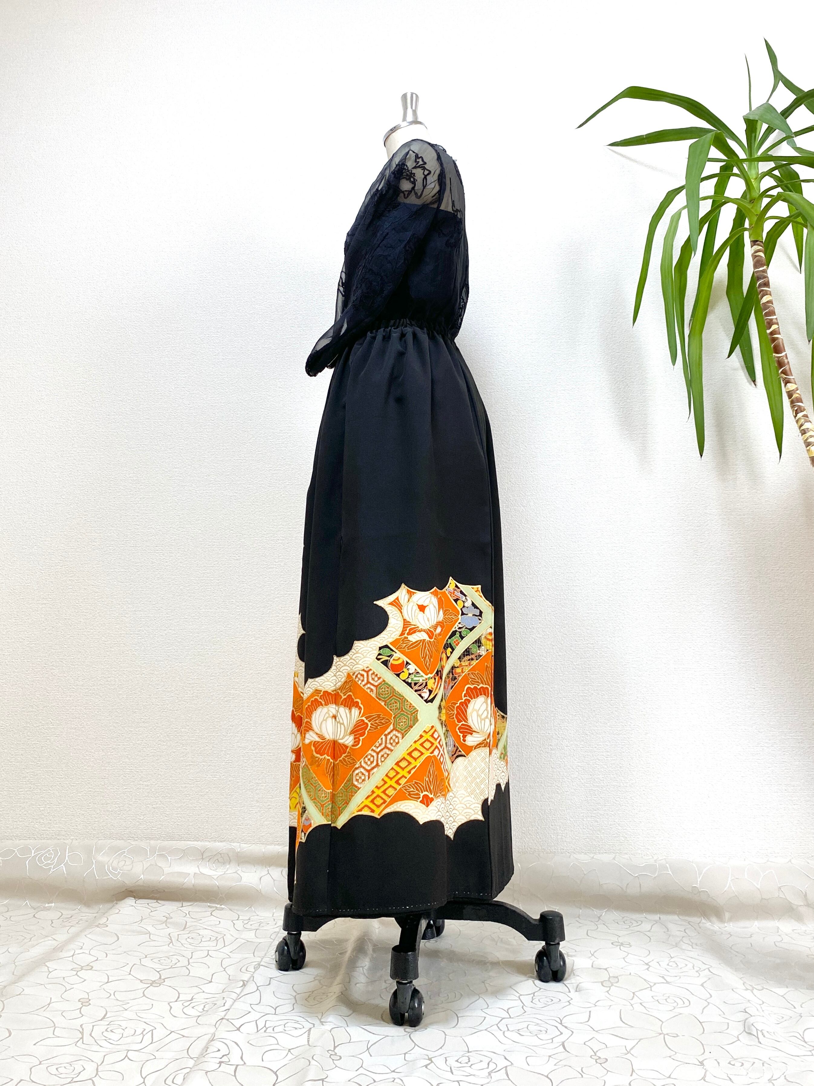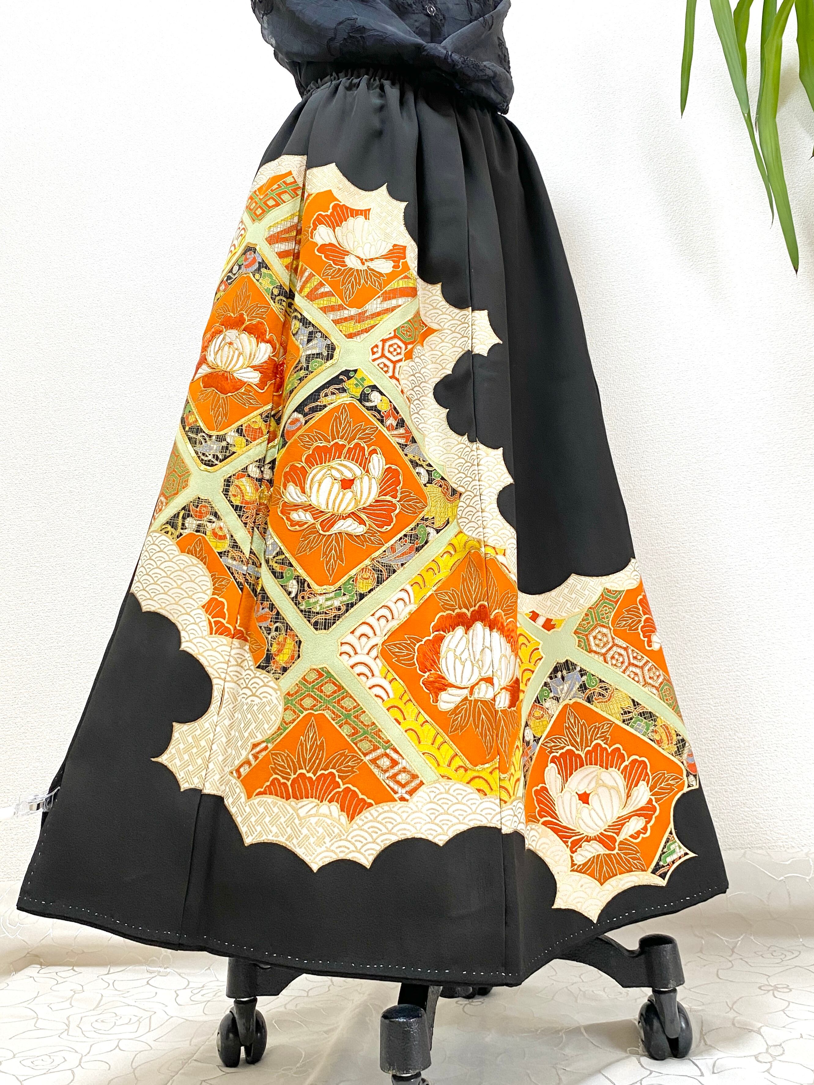 大人可愛いセレブ着物スカートフリーサイズ1点物黒留袖着物リメイクウエストゴムロングスカート