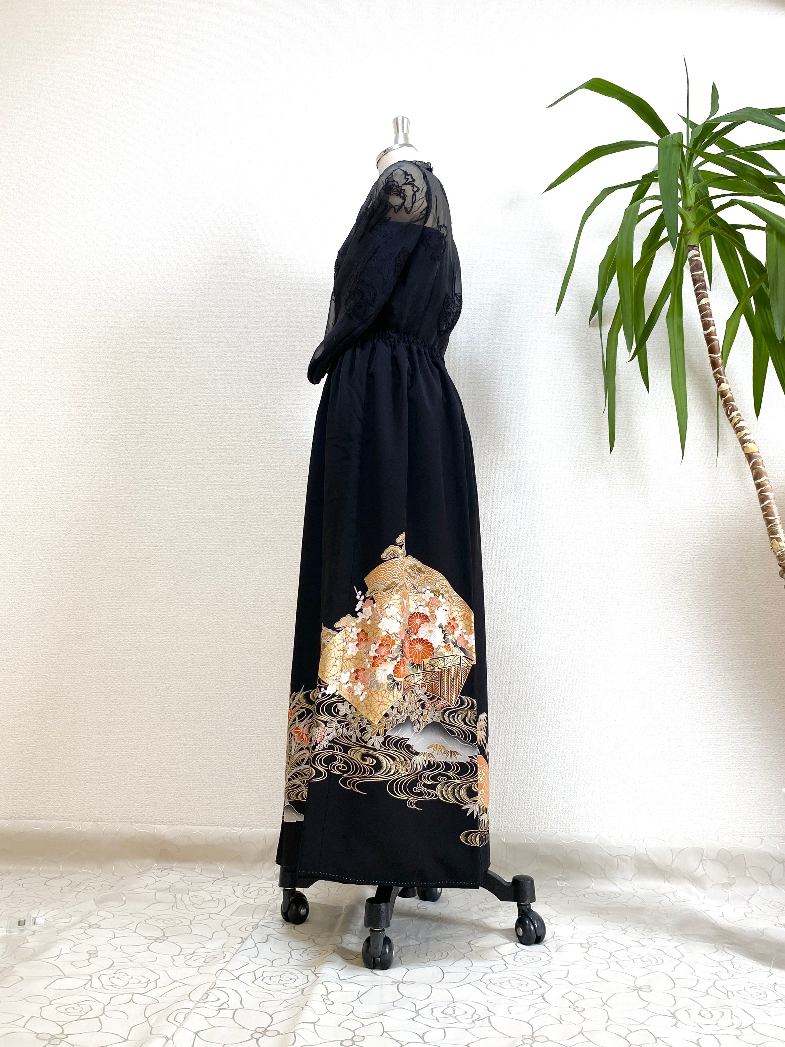 大人可愛いセレブ着物スカートフリーサイズ黒留袖着物リメイクウエストゴムロングスカート