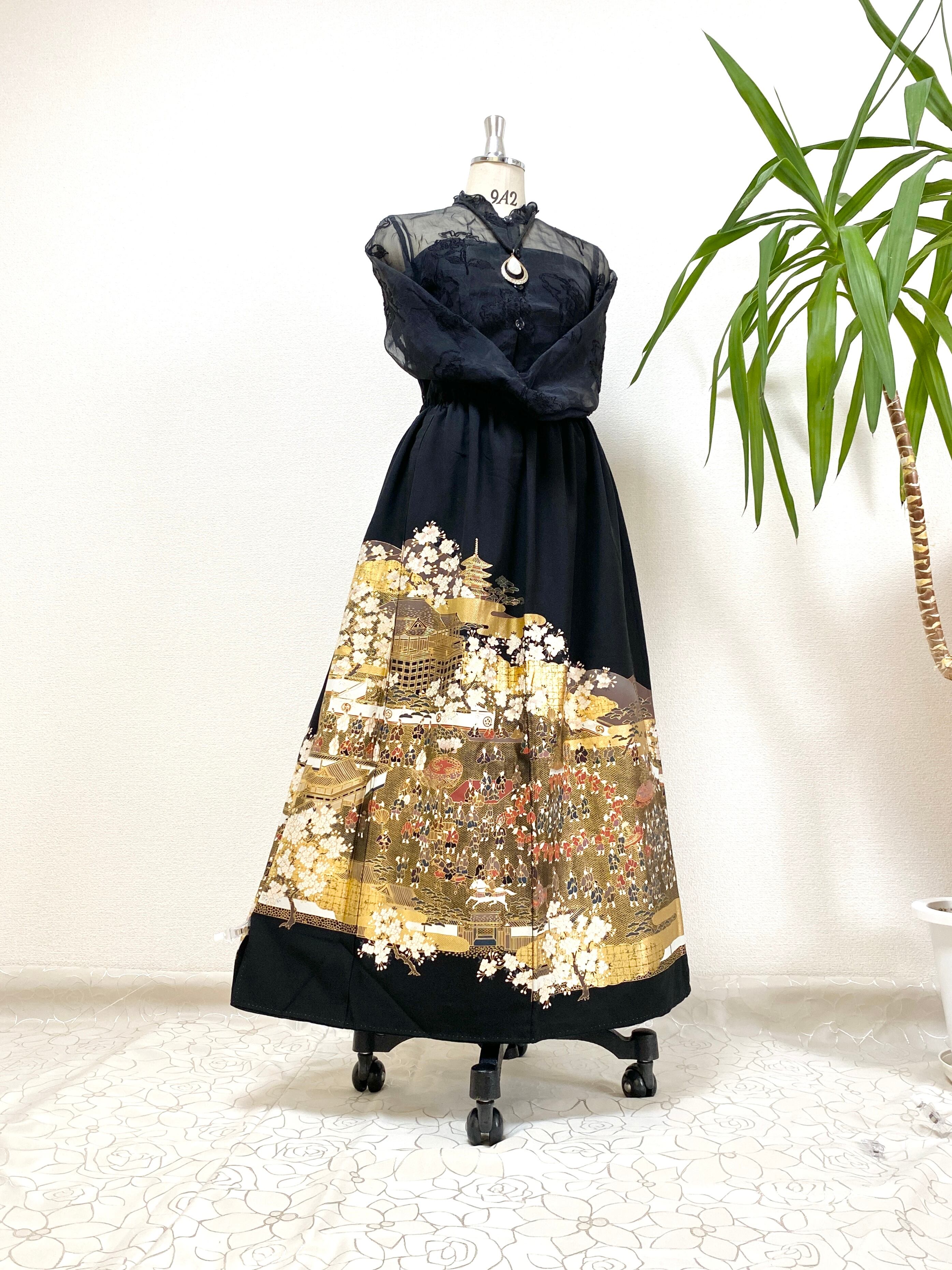 大人可愛いセレブ着物スカートフリーサイズ黒留袖着物リメイクウエストゴムロングスカート