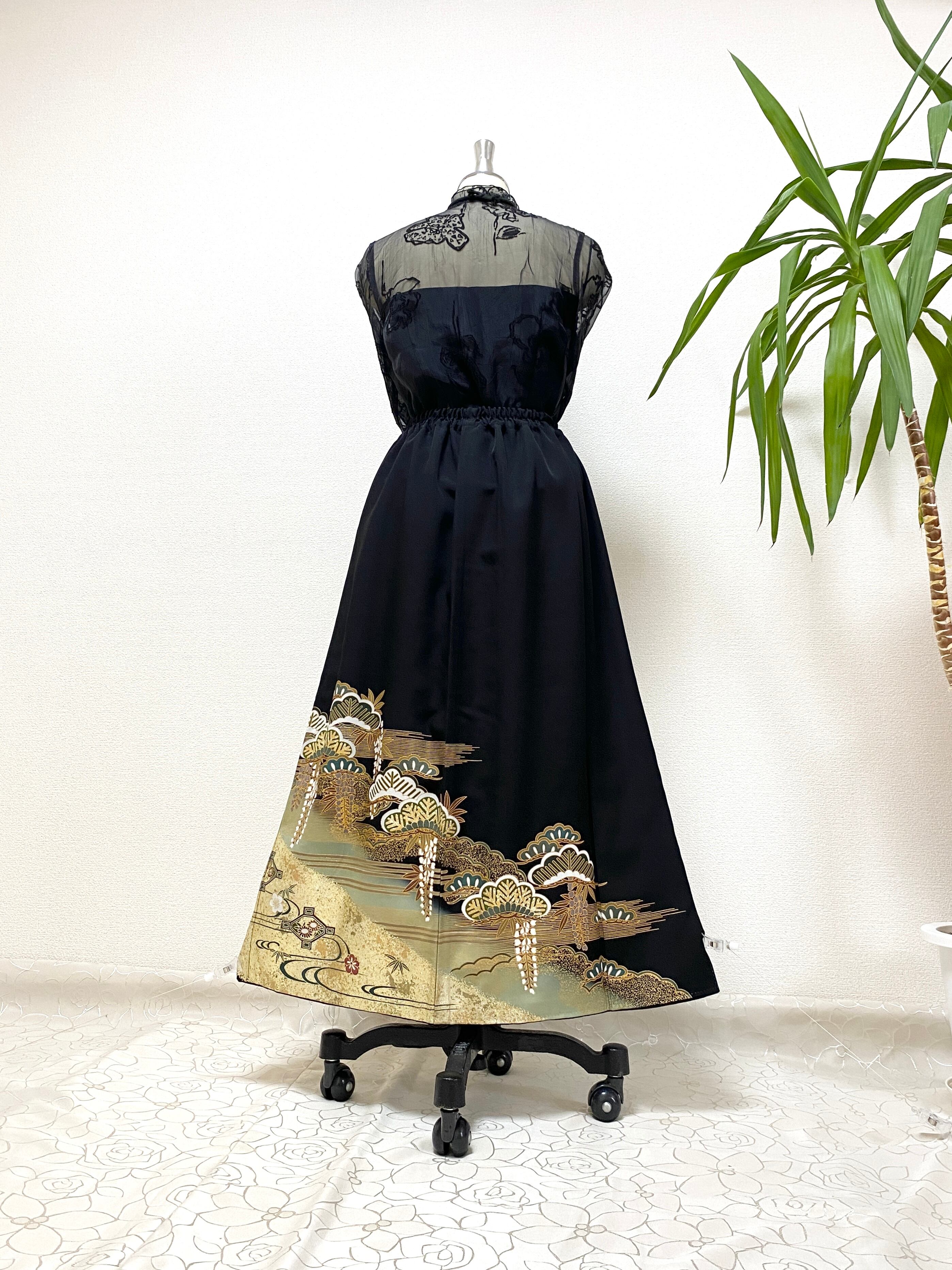 大人可愛いセレブ着物スカートフリーサイズ黒留袖着物リメイクウエストゴムロングスカート